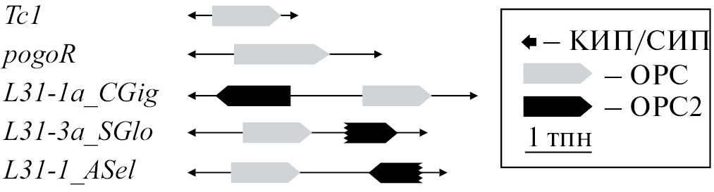 Рис. 1. Структура транcпозонов суперсемейства L31. 1 тпн–1000 пн; КИП/СИП – концевые инвертированные повторы или субконцевые инвертированные повторы; ОРС – открытая рамка считывания, кодирующая транспозазу; ОРС2 – открытая рамка считывания, кодирующая белок с неизвестной функцией.