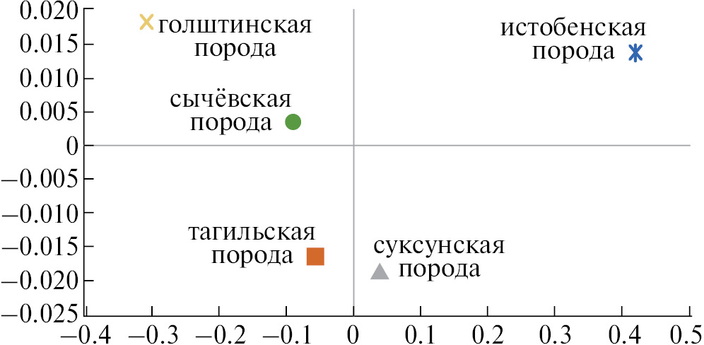 При distance-based генетическом анализе пяти молочных пород крупного рогатого скота по трем полиморфизмам использован метод главных координат пакета GenAlEx (рис. 4). По упрощенной модели генетического расщепления видно, что наиболее генетически удаленная друг от друга пара пород – голштинская и истобенская, что подтверждает результаты по каждому из SNP исходя из диаграмм Де Финетти.