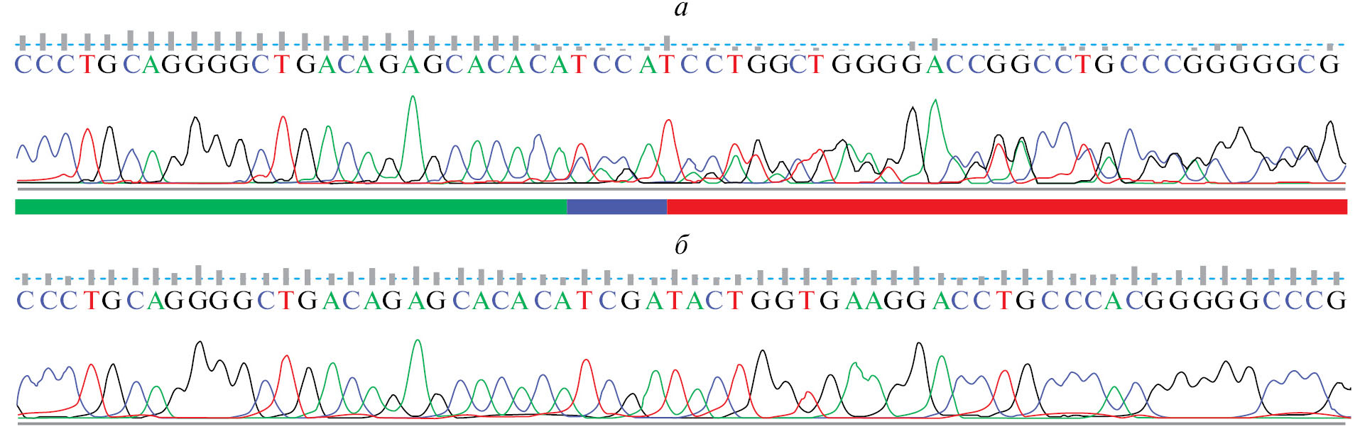 Рис. 2. Результаты секвенирования по Сэнгеру области гена MYBPC3 у пациента с ГКМП II.3 (пробанд), носителя варианта c.2781insCACA в гетерозиготном состоянии (электрофореграмма а), и у пациента III.2, не являющегося носителем (электрофореграмма б). На электрофореграмме A зеленой полосой показан регион в 5’-области от индексного варианта, синей полосой – инсерция TGTG, оранжевой полосой – “удвоенная последовательность" в 3’-области от варианта.