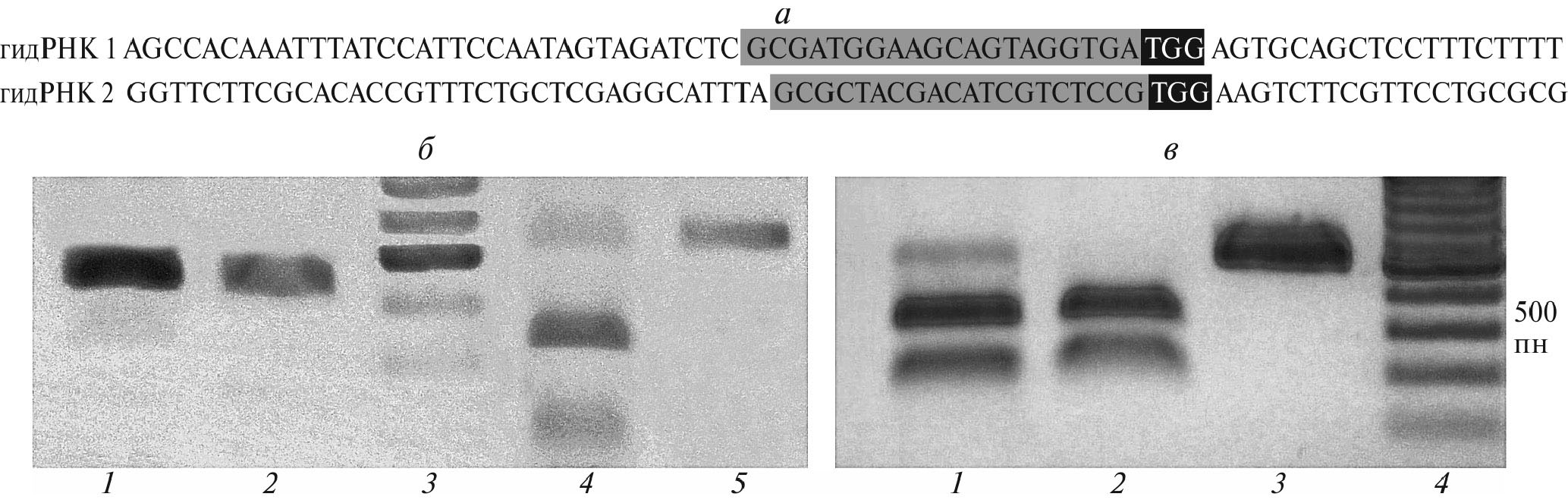 Рис. 1. Оценка эффективности работы РНП-комплексов in vitro и в протопластах кукурузы. а – нуклеотидные последовательности участков гена GEX2, содержащие протоспейсеры для гидРНК 1, 2; целевые сайты для гидРНК выделены серым цветом, РАМ-последовательности – черным. б – электрофорез ПЦР-продуктов с фрагмента гена GEX2 после обработки РНП-комплексами in vitro; дорожки: 1 – ПЦР-продукт с целевым локусом для гидРНК 1 после инкубации с РНП-комплексом; 2 – ПЦР-продукт с целевым локусом для гидРНК 1 (без обработки); 3 – маркер молекулярного веса ДНК; 4 – ПЦР-продукт с целевым локусом для гидРНК 2 после инкубации с РНП-комплексом; 5 – ПЦР-продукт с целевым локусом для гидРНК 2 (без обработки). в – электрофорез ПЦР-продуктов с целевым локусом для гидРНК 2. Дорожки: 1 – ПЦР-продукт с фрагмента гена GEX2, полученный с ДНК протопластов кукурузы после трансформации с РНП-комплексами (45 мг нуклеазы/15 мг гидРНК) и обработанный рестриктазой BstMAI (ожидаемые размеры полос после гидролиза ‒ 324 и 183 пн); 2 – ПЦР-продукт с фрагмента гена GEX2, полученный с ДНК листа кукурузы и обработанный BstMAI; 3 – ПЦР-продукт с фрагмента гена GEX2 без обработки BstMAI (507 пн, контроль); 4 – маркер молекулярного веса ДНК, шаг 100 пн.