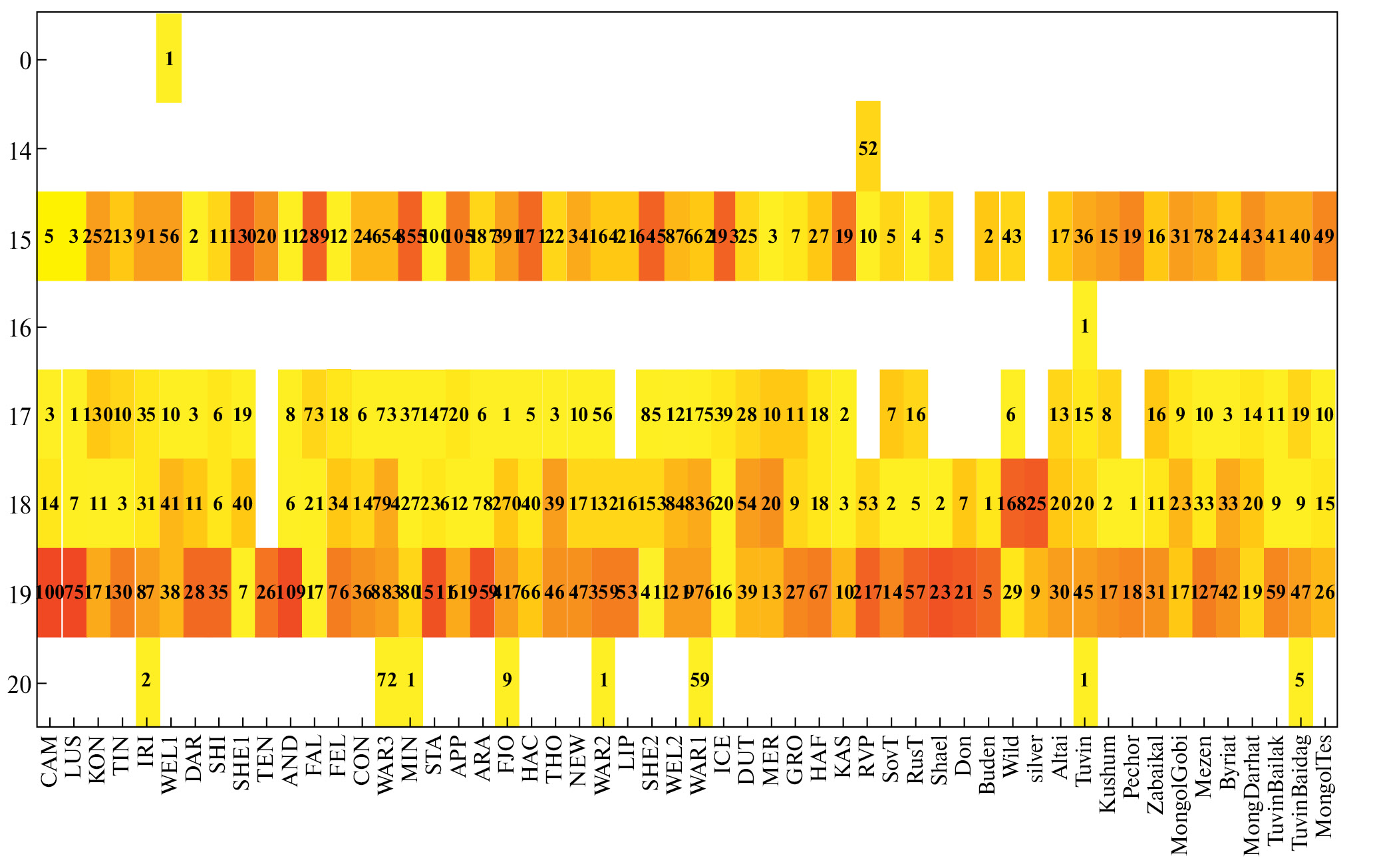 Рис. 1. Тепловая карта частот аллелей для 54 пород лошадей. Цветом от желтого к красному обозначена частота встречаемости аллеля в популяции. Идентифицирован приват-аллель 14-го локуса HTG7 для русской верховой породы лошадей (RVP).