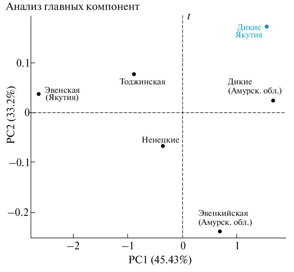 Анализ главных компонент (рис. 2) показывает, что ненецкая порода оленей и тоджинский экотип отличаются от остальных выборок по полиморфизмам в сайтах 3788 и 3797 (коэф. корреляции r(C) = −0,91, p = 0.012), у ненецкой породы в данных позициях доли минорного аллеля превышают 0.2, в то время как у тоджинских оленей минорный вариант T в позиции 3797 отсутствует. По второй главной компоненте, объясняющей 41.3% дисперсии, обосабливаются от остальных домашние эвенские и дикие олени из Якутии. Их объединяет отсутствие минорных гомозигот и низкая частота минорного аллеля в позициях 3862 (r(A) = 0.83, p = 0.044) и 4138 (r(A) = −0.92, p = 0.008).