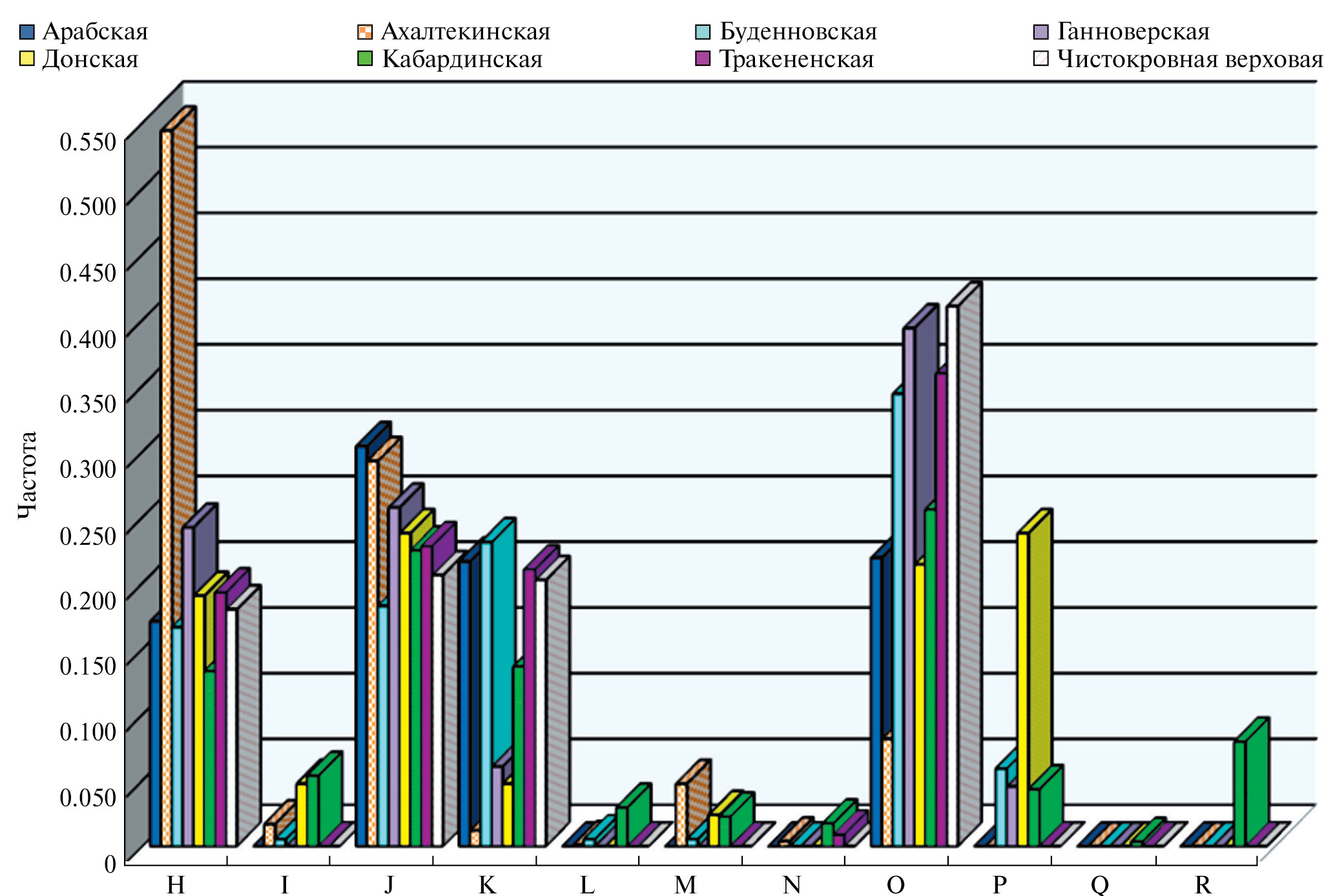 Одним из наиболее информативных панельных STR-локусов является LEX3, расположенный на X-хромосоме, так как он характеризует разнообразие и связи популяций по материнской линии. Изучение этого локуса у верховых пород показало наличие 11 аллелей из 14 зарегистрированных ISAG. При этом максимальная частота аллеля LEX3M была установлена в арабской породе – 0.366, LEX3P – в чистокровной верховой – 0.330, а LEX3K – 0.108 – у лошадей кабардинской породы. У кабардинских лошадей были обнаружены редкие аллели LEX3Q и LEX3G, что наводит на мысль о наличии оригинальных женских линий в этой популяции (рис. 2).