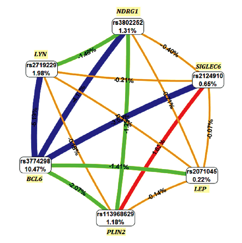 В рамках рассматриваемой модели также интересно проследить связи между локусами изученных генов. Установлено, что характер взаимодействия между локусами rs3774298 BCL6 и rs2071045 LEP – умеренно антагонистический (–1.41% энтропии). Для полиморфного варианта rs3774298 гена BCL6 характерен преимущественно антагонистический тип взаимодействий, тогда как вариант rs2071045 гена LEP демонстрирует в основном аддитивный характер взаимосвязей с другими генными вариантами, вошедшими в модели (rs3802252 (NDRG1), rs2719229 (LYN), rs113968629 (PLIN2), rs2124910 (SIGLEC6)), построенными для тяжелой формы ПЭ.