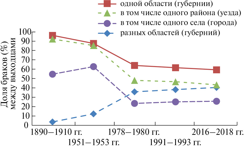 Во-вторых, с конца ХIХ до начала ХХI в. значительно уменьшилась доля браков, заключаемых между уроженцами одной губернии (области) (в 1.6 раза), одного уезда (района) (в 2 раза) и одного села (в 2.2 раза), тогда как удельный вес браков, заключаемых между выходцами разных областей, возрос в 10.6 раза (рис. 2). Установлена сильная прямая корреляционная связь между долями изолокальных браков (r = 1.00, p < 0.05), удельный вес которых отрицательно коррелировал с долей гетеролокальных браков (r = −1.00, p < 0.05).