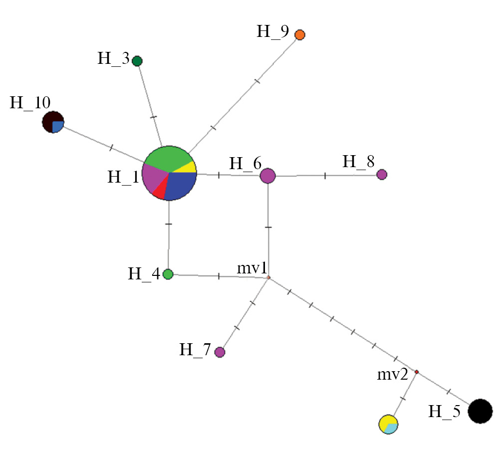 Рис. 1. Медианная сеть митохондриальных гаплотипов (митотипов), идентифицированных в изученных выборках беляночки L. morsei (Fent.) на основе анализа нуклеотидной последовательности фрагмента гена COI. Цветовые обозначения гаплотипов: фуксия – Чуть: Н1 (n = 5), Н6 (2), Н7 (1), Н8 (1); черный – Румыния: Н5 (5); бирюзовый – Словения: Н2 (1); голубой – Прокопьевка: Н10 (1); желтый – Казахстан: Н1 (2), Н2 (2); коричневый – Дон: Н10 (3); оранжевый – Кобра: Н9 (1); салатовый – Новосибирск: Н1 (10), Н4 (1); красный – Приполярный Урал: Н1 (2); синий – Красный Яр: Н1(6); зеленый – Ю. Корея: Н3 (1).