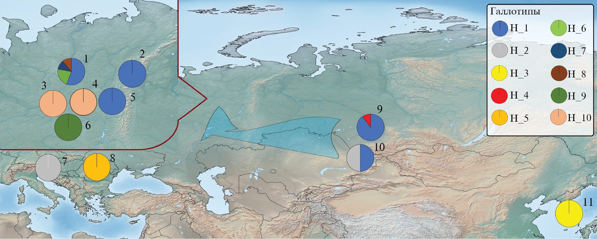 Рис. 2. Карта-схема распределения гаплотипов в выборках L. morsei (Fent.) и вероятные пути расселения вида в постледниковую эпоху. Места сбора образцов: 1 – Чуть, 2 – Приполярный Урал, 3 – Прокопьевка, 4 – Дон, 5 – Красный Яр, 6 – Кобра, 7 – Словения, 8 – Румыния, 9 – Новосибирск, 10 – Казахстан, 11 – Южная Корея. Стрелкой обозначено вероятное направление миграции вида на европейский северо-восток России.