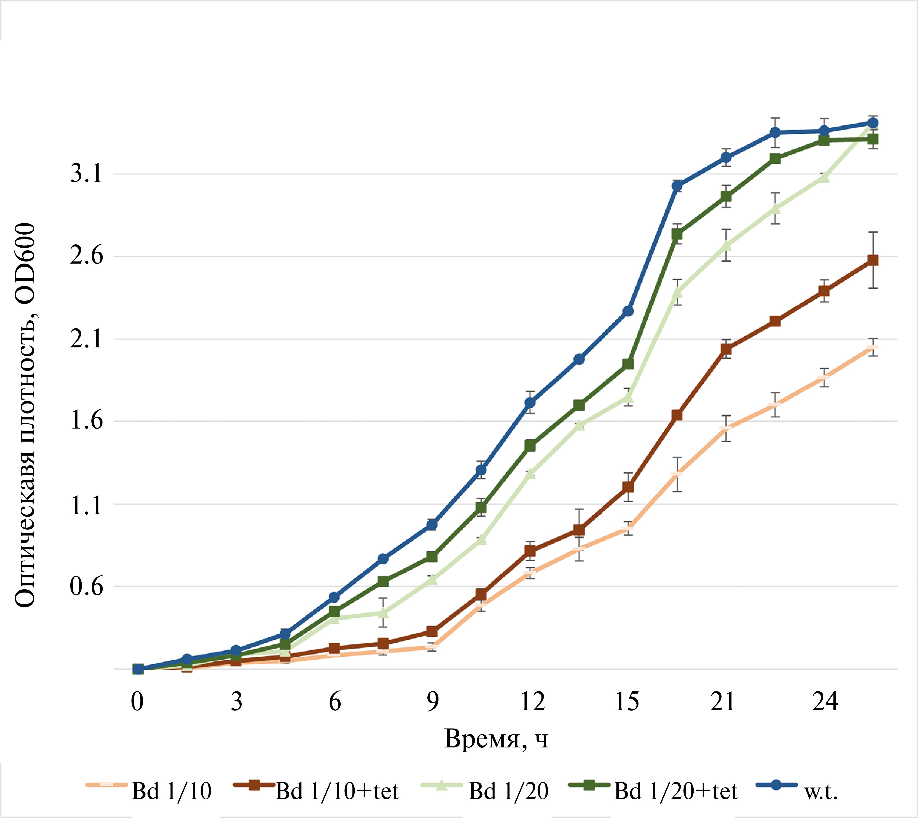 На основании полученных данных далее провели анализ скорости роста M. smegmatis в среде с бедаквилином при индукции тетрациклином. Нами было проведено сравнение скорости роста штамма M. smegmatis mc2 155 в трех различных условиях: контроль (w.t.), штамм в присутствии индуктора (тетрациклина) и бедаквилина и штамм в присутствии бедаквилина без индукции. Концентрации бедаквилина составляли 1/20 МИК, 0.5 нМ и 1/10 от МИК, 1 нМ соответственно. Использование большей концентрации приводило к существенному замедлению роста штамма и невозможности оценки результатов (рис. 3).