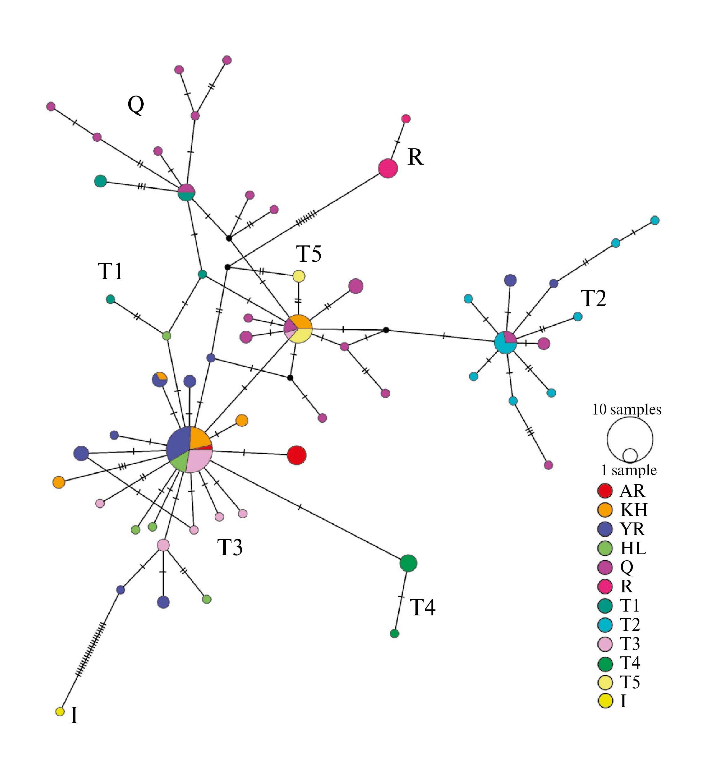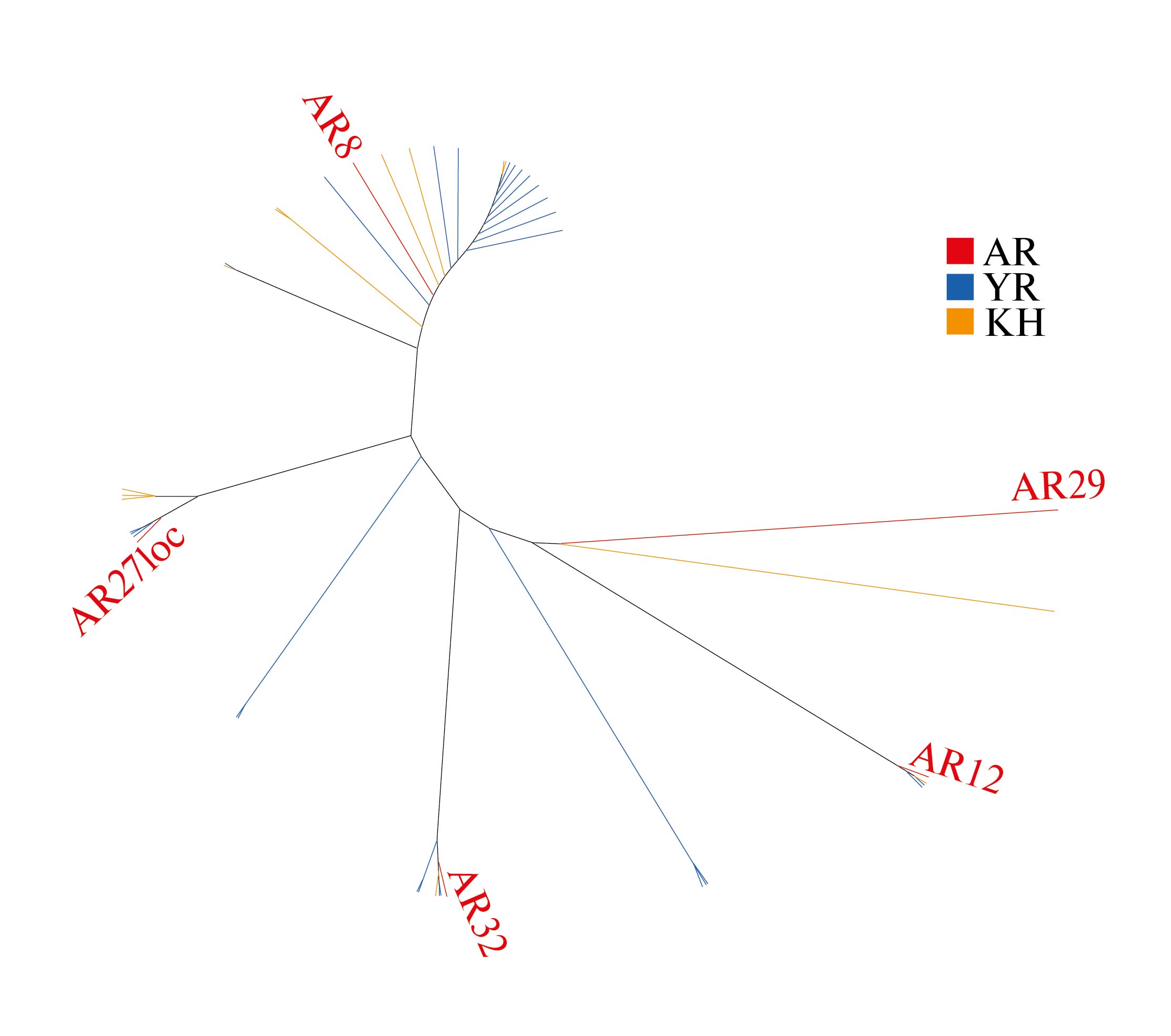 Рис. 2. Взаимосвязь археологических и современных образцов ярославской и холмогорской пород на основании анализа полиморфизма D-петли последовательности мтДНК. AR – археологические образцы: современные образцы: YR – ярославская порода, KH – холмогорская порода.