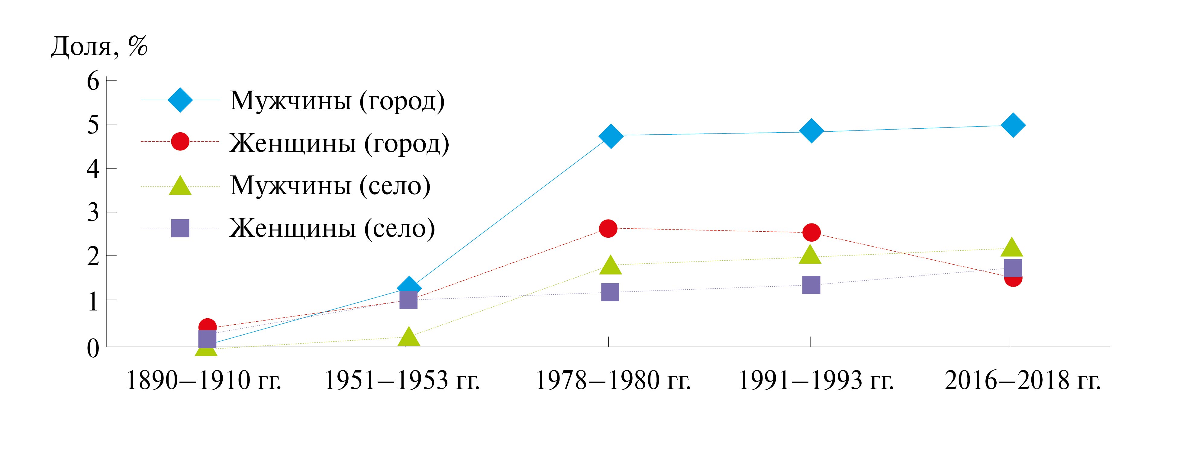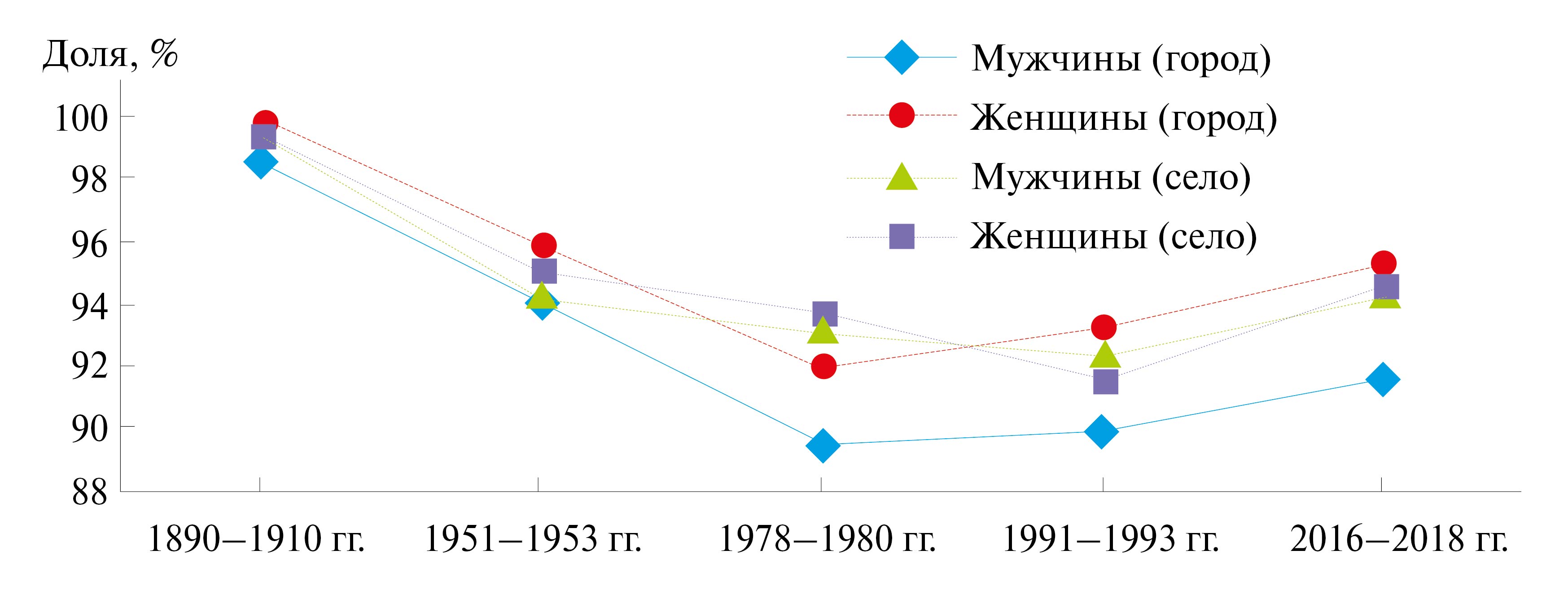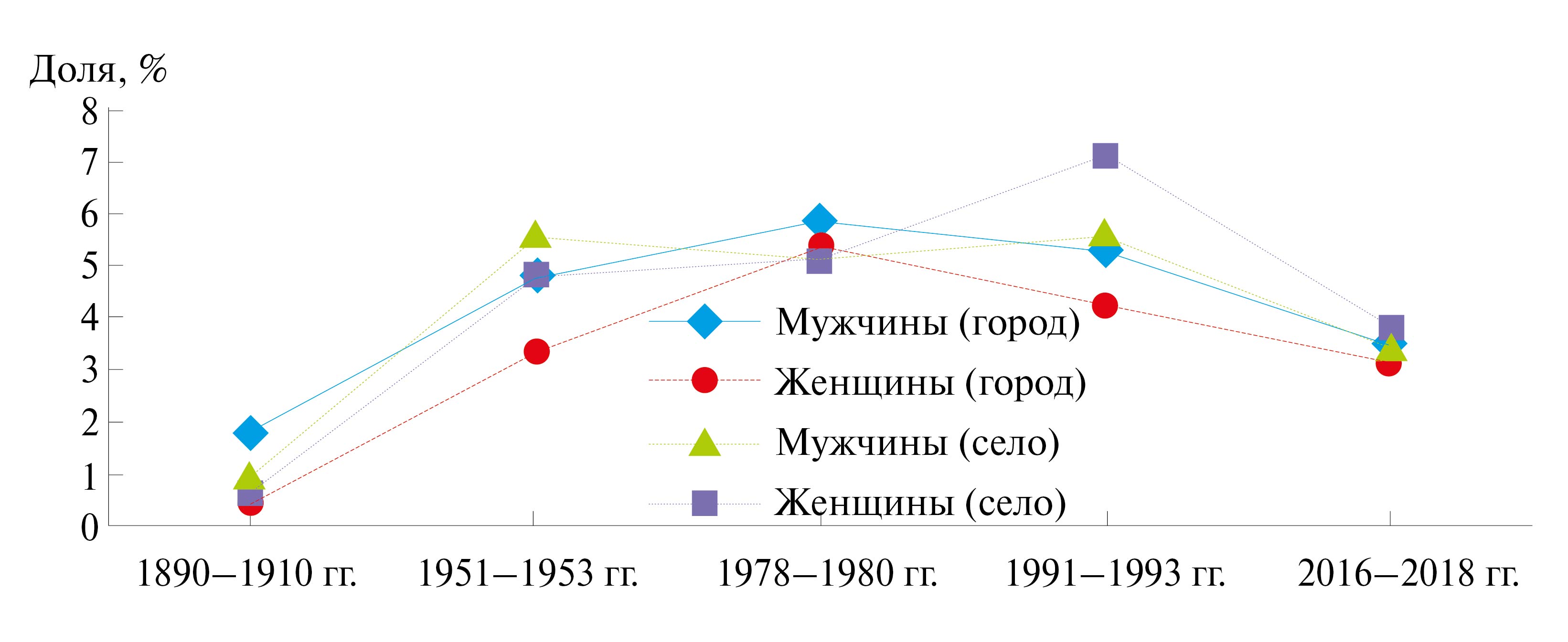 Административно-территориальные преобразования ХХ в., рост численности населения области, изменение эффективного размера популяции и активные миграционные процессы, о причинах и особенностях которых в разные временные периоды упоминалось в предыдущих работах [21–24], способствовали незначительному уменьшению доли русского населения (у мужчин с 99.02 до 90.93%, у женщин с 99.42 до 91.88%), увеличению доли украинцев (у мужчин с 0.99 до 5.05%, у женщин с 0.57 до 5.38%) и лиц других национальностей (у мужчин с 0 до 4.03, у женщин с 0.20 до 2.74%). При этом в регионе на протяжении всего 130-летнего периода значимых отличий в динамике мужчин и женщин русской национальности между городом и селом не установлено. Тогда как доля женщин украинской национальности с 1890–1910 гг. по 2016–2018 гг. увеличилась в среднем в 7.5 раза в городе и в 6 раз в селе, а доля мужчин украинской национальности значительно увеличилась в селе (в среднем в 4 раза), чем в городе (в среднем в 2 раза). За анализируемый период наблюдался рост доли других национальностей (кроме русской и украинской) среди женщин как в городе (в 5 раз), так и в селе (в 6 раз), а среди мужчин более интенсивный рост наблюдался в городе (в 5 раз), чем в селе (в 2 раза).