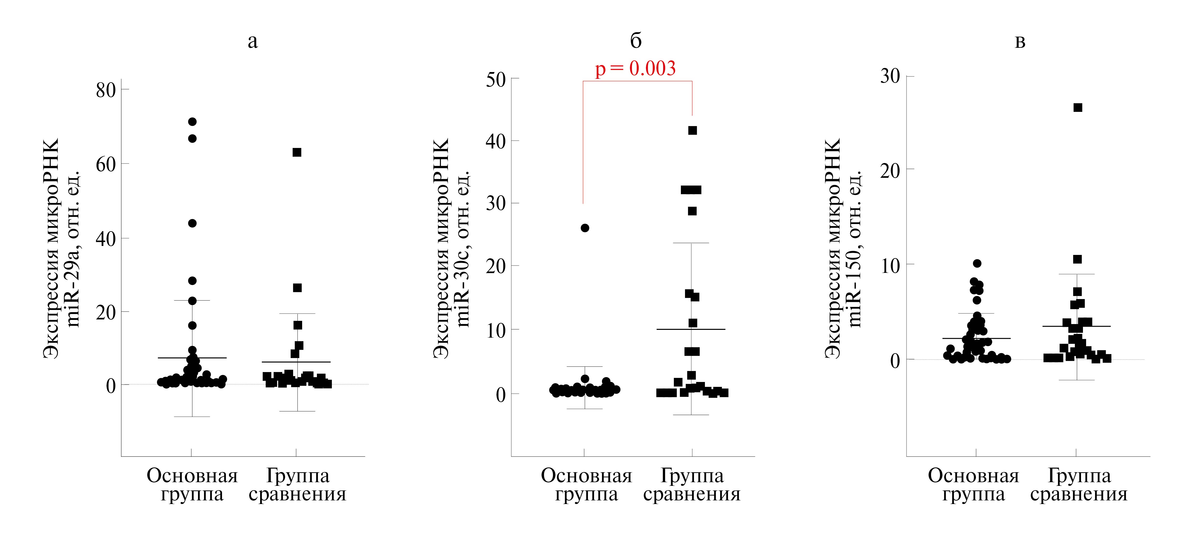 При исследовании показателей относительной экспрессии микроРНК в основной группе было выявлено более низкое (p = 0,003) относительное содержание микроРНК miR-30с, чем в группе сравнения. Полученные результаты также графически проиллюстрированы на рис. 1.