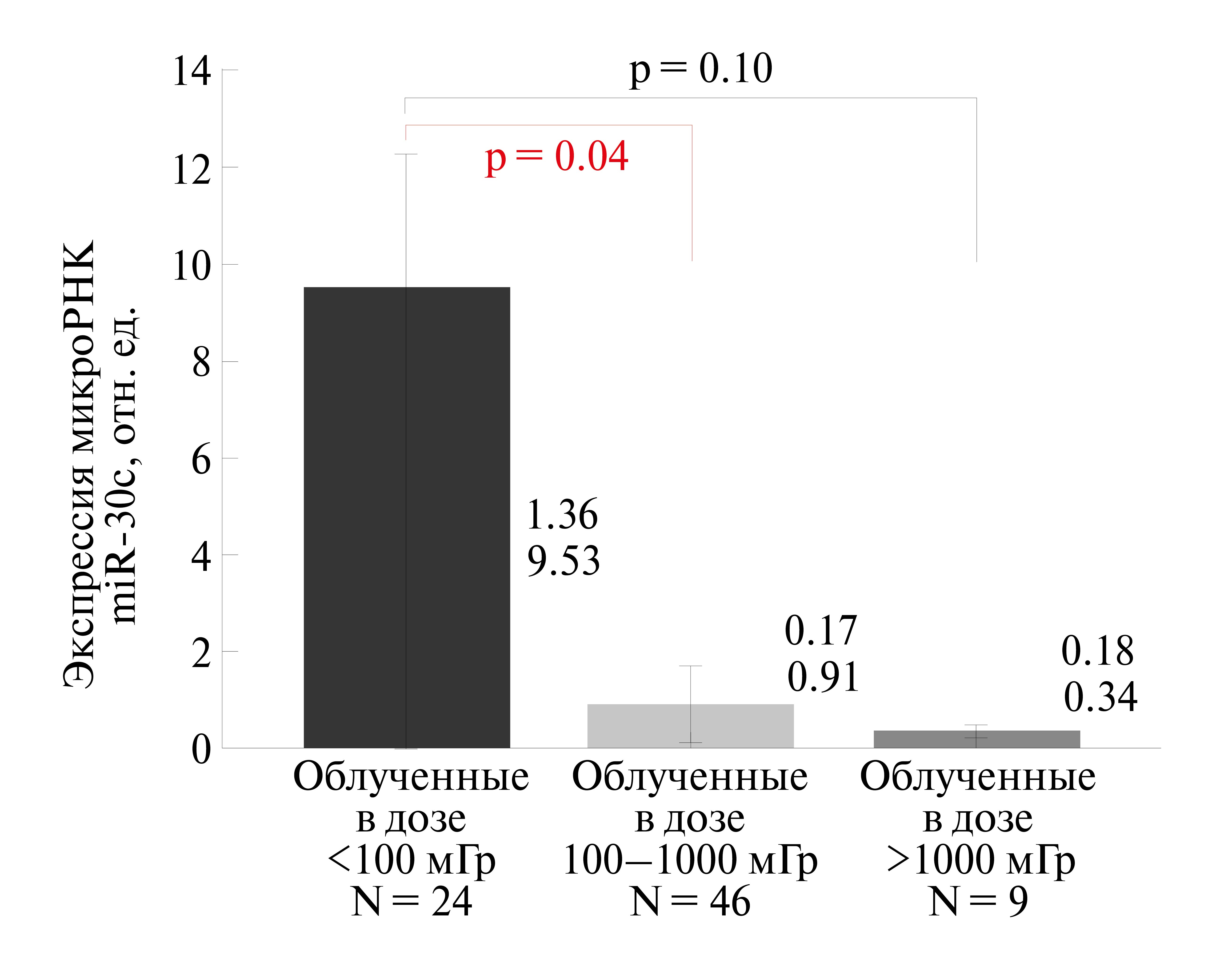 В результате проведенного исследования у людей, подвергшихся низкоинтенсивному хроническому радиационному воздействию с накопленными дозами облучения ККМ в диапазоне от 86,72 до 1867,55 мГр наблюдалось снижение в периферической крови экспрессии зрелой микроРНК miR-30c, при этом была установлена слабая отрицательная корреляционная связь между экспрессией микроРНК miR-30c и накопленной дозой облучения ККМ, а также нелинейная зависимость ее экспрессии от накопленной дозы облучения ККМ, а также облучения тимуса и периферических лимфоидных органов. Статистически значимые различия в относительном содержании данной микроРНК также наблюдались между дозовыми подгруппами. В то же время экспрессия данной микроРНК не продемонстрировала связи с факторами нерадиационной природы, такими как пол, возраст или национальность.