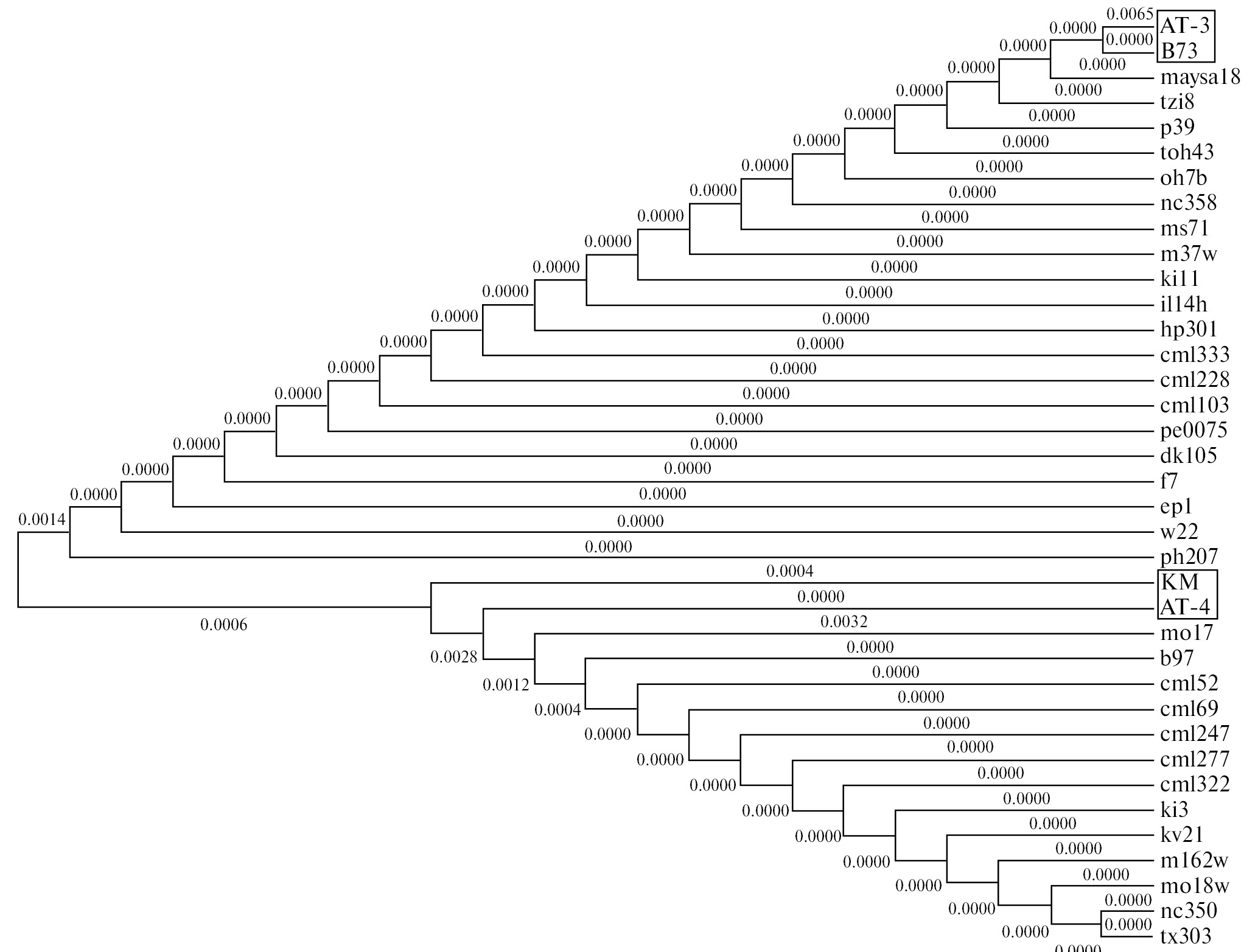 Линии АТ-1 и АТ-4 имеют много совпадений по ОНЗ у гена Zm_Fie1 (рис. 3) и входят в одну группу (рис. 6). Линия АТ-3 от них сильно отличается и находится в отдельной группе, хотя обе линии (АТ-3 и АТ-4) являются прямыми потомками линии АТ-1. То есть между АТ-3 и АТ-4 наблюдается разница как по гену Zm_Chr106 (рис. 5), так и по гену Zm_Fie1 (рис. 6). Линия АТ-3 и референсная линия B73 имеют р-расстояние 0.1849. Возможно, делеция в шесть нуклеотидов в положении 1362‒1367 (рис. 3) послужила причиной таких различий (рис. 6).