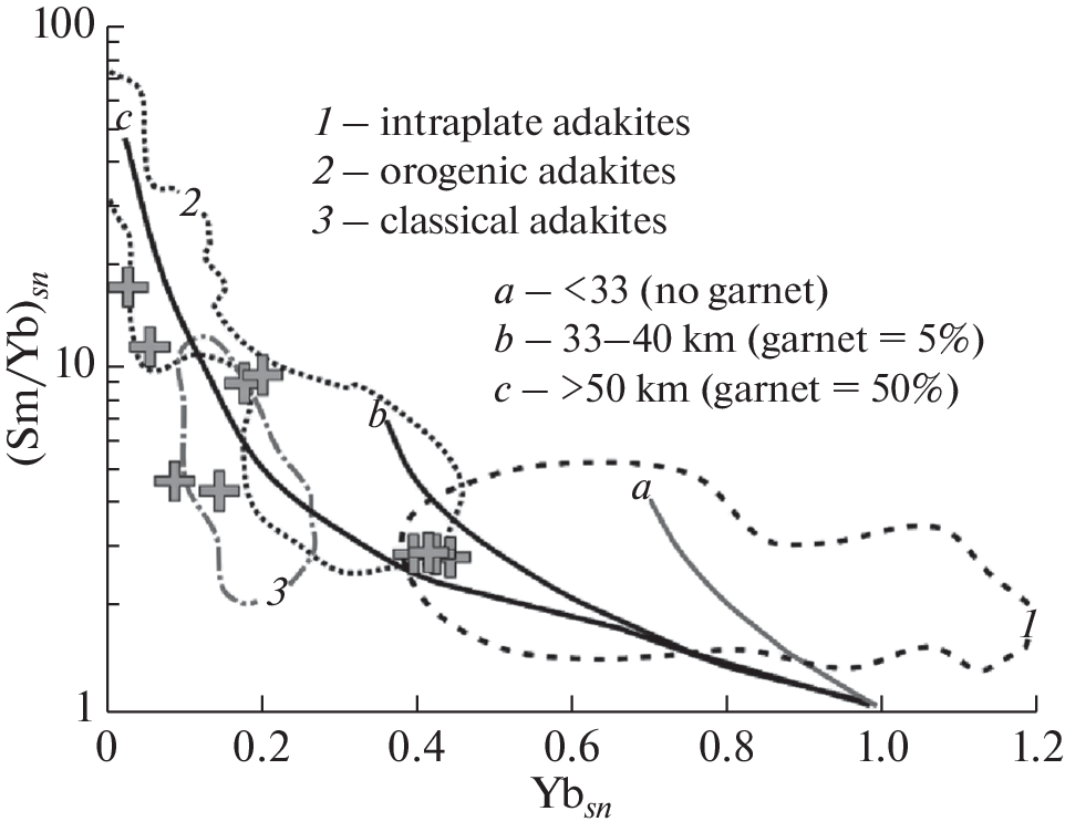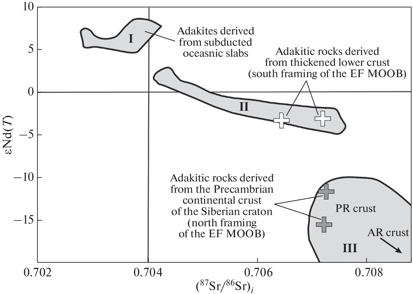 The examination of original and available petrochemical, geochemical, and isotope (Sm-Nd, Rb-Sr) data showed that subalkaline granitoids in the northern framing of the eastern flank of the Mongol–Okhotsk orogenic belt belong to the adakite series. The granitoids are characterized by high Sr/Y, Sr, Al2O3, and LREE, extremely low HREE concentrations, and the absence of negative Eu anomalies. The results obtained and the analysis of the geodynamic setting of their formation made it possible to assume that the granitoids were formed at a depth of more than 45 km through melting of garnet-bearing (20–50% garnet) rocks, which are likely represented by lower crustal Precambrian complexes widespread in the southern framing of the Siberian craton. The source of parental melts involved both mantle and crustal matter. This likely occurred in a subduction setting through melting of frontal or lateral parts of oceanic slab in subduction “windows”. The Late Jurassic–Early Cretaceous Chubachin adakite complex (149–138 Ma) was distinguished. Its formation preceded the initiation of suprasubduction differentiated calc-alkaline magmatism (140–122 Ma) in the northern framing of the eastern flank of the Mongol–Okhotsk orogenic belt.