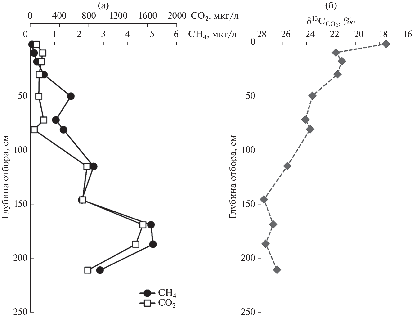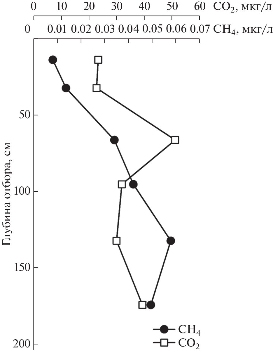 Проведено исследование распределения концентраций СН4 и СО2 и других газов в осадках Карского, Лаптевых и Восточно-Сибирского морей. Установлено, что существует корреляция между СН4 и СО2 в большинстве колонок морских осадков. Коэффициент корреляции R для осадков Карского моря варьируется в диапазоне от 0.58 до 0.97 и не зависит от характера распределения газов по глубине осадка. Предположительно, в морских осадках метаногенез, сопряженный с сульфатредукцией, и гидрогенотрофный метаногенез приводят к росту концентрации СН4 на фоне высокой концентрации СО2. Наличие большой концентрации диметилсульфида в осадках свидетельствует о параллельном образовании CH4 и CO2 в результате метилотрофного метаногенеза с участием CH3SCH3. В верхних слоях осадка могут наблюдаться противоположные закономерности распределения концентраций газов СН4 и СО2. То, что коэффициенты корреляции газов СН4 и СО2 для осадков моря Лаптевых могут иметь отрицательные и положительные значения, вероятно, обусловлено тем, что в верхних слоях осадка, захваченного короткими колонками, процессы газообразования идут иначе, по сравнению с глубокими слоями.
