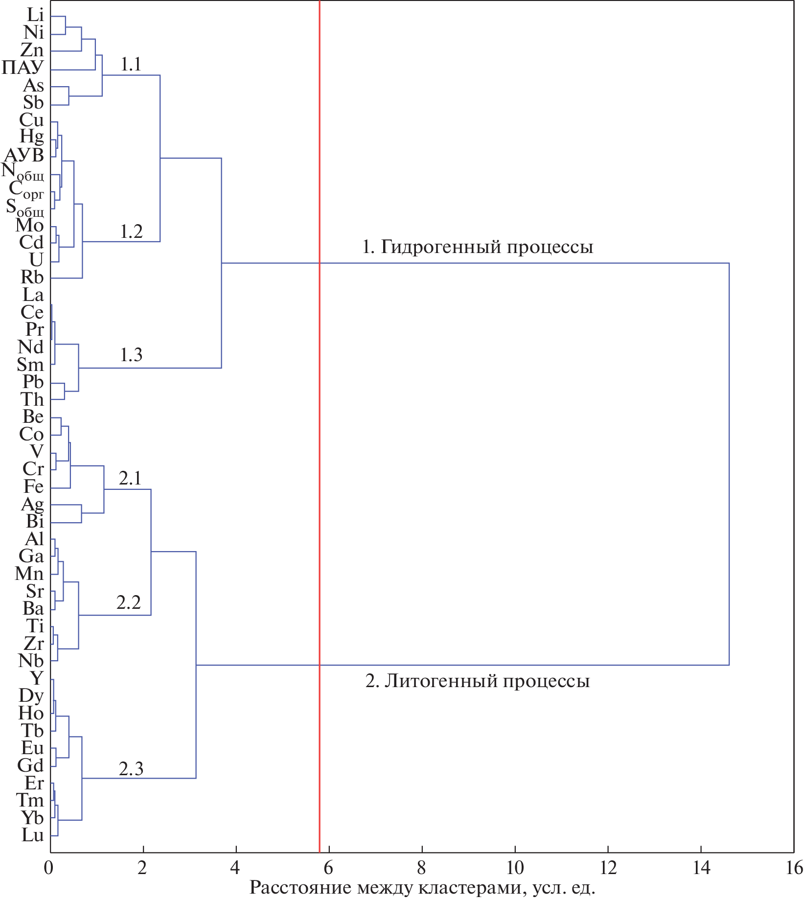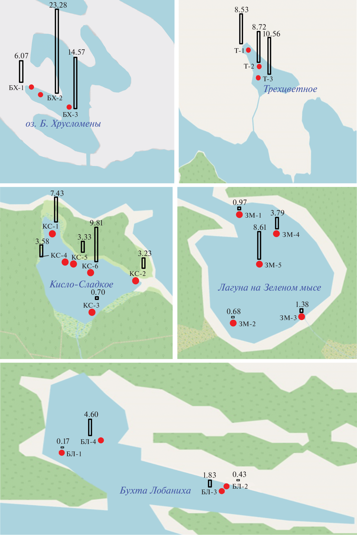 It is shown that a large number of organic compounds of autochthonous and allochthonous nature are formed in the bottom sediments of separating waterbodies in the Kandalaksha Gulf of the White Sea, despite their subarctic position. The average content of Corg, Ntot, Stot, aliphatic hydrocarbons, and polycyclic aromatic hydrocarbons in the bottom sediments are 5.33, 0.78, 0.53%, 817 μg/g, and 261 ng/g, respectively, which are significantly higher than in sediments of the open areas of the White Sea. The eutrophication of these waterbodies depends on their connection with the sea. It was found that anoxic pelitic sediments of separating lakes are enriched in Cu, Cd, Mo, Hg and U compared to sediments of the open sea bays in Kandalaksha Gulf. Thereby, the Hg and Mo contents are 2 and 14 times higher than their maximum permissible concentrations (MPC) (0.3 and 3 µg/g, respectively). A positive correlation with total sulfur (r > 0.8, р < 0.01) indicates the prevailing occurrence of these metals in form of poorly soluble sulfides.
