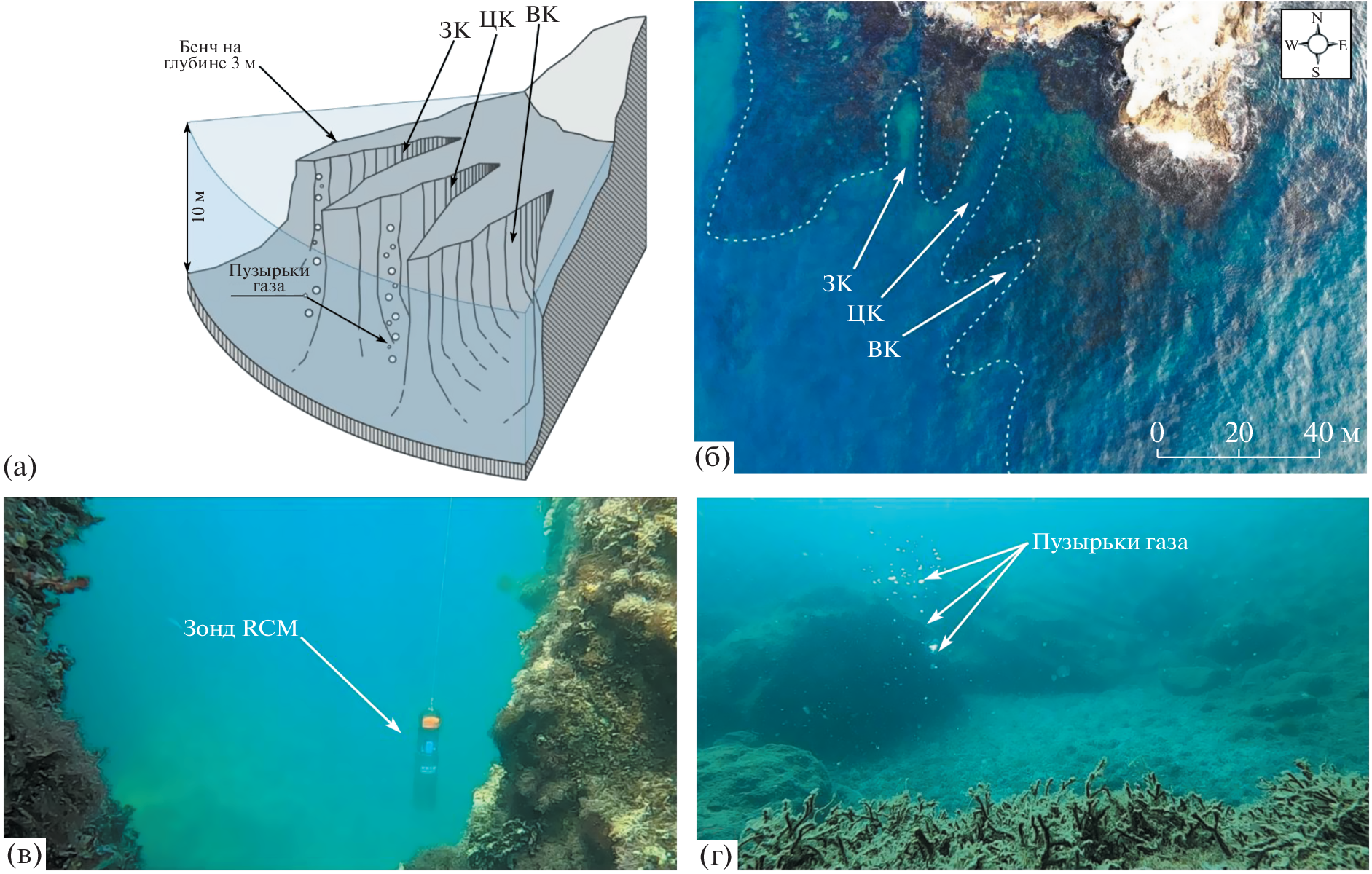 Пузырьковая и флюидная разгрузка морского дна может влиять на газовый состав воды, в том числе на содержание растворенного кислорода. В летние сезоны в период с 2019 по 2021 гг. в районе мелководных метановых сипов Гераклейского полуострова были проведены серии вертикального профилирования гидрологических параметров воды (концентрации растворенного кислорода O2, температуры T, солености S, скорости течения U). Район исследований представлял собой подводный выступ с разломами в виде трех каньонов, сложенных плотными известняками, в двух из которых были обнаружены пузырьковые газовыделения. Показана значительная вариабельность O2 в каньонах, где наблюдались газовыделения: от 0.1 мг/л (1%) до 5.8 мг/л (80%) в придонном слое на фоне нормоксии на фоновых площадках. Гипоксия в придонных слоях над местом газовыделений устанавливалась в условиях отсутствия турбулентности и наличия температурной стратификации. Показано снижение S с глубиной, максимальная разница значений достигала 0.4‰. В компонентном составе пузырькового газа преобладал метан (68.5–75.5%), изотопный состав углерода метана пузырькового газа δ13СVPDB за период исследований изменялся от –67.9‰ (2019 г.) до –59.8‰ (2020 г.). Это свидетельствует о преобладании CH4 микробного генезиса, и различных условиях его образования и созревания в разные периоды исследований. В районах газовыделений обнаружены бактериальные пленки, основу которых составляли сероокисляющие бактерии.