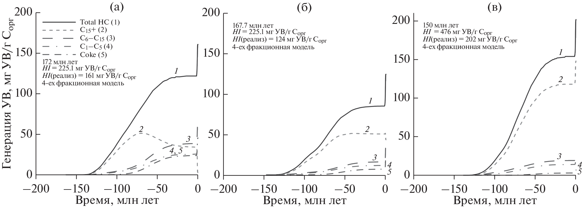 A model of the thermal evolution of the lithosphere of the West Siberian Basin in the area of Superdeep Well SG-6, which was drilled through the Koltogor–Urengoi graben, is used to numerically estimate the generation of various hydrocarbon (HC) fractions by the Triassic and Jurassic source rocks. The thermal model assumes the emplacement of a sill into the subsurface layers of the basement in the Early Jurassic and hydrothermal activity in the Late Pliocene–Lower Pleistocene, which noticeably impacted the conversion history of the HC potential of the Triassic and Jurassic source rocks. For the Triassic Pur formation, the emplacement of the sill into the subsurface layers of the basement in the Lower Jurassic drastically intensified the conversion of the HC potential to 84% and the degradation of more than 97% of the generated light oil mass. Calculations show that the heavy oil generated by the rocks of the Pur, Togur, and lower horizons of the Tyumen formations has degraded almost completely as a result of secondary cracking, while heavy oil predominates among the generated HC fractions in the upper horizons of the Tyumen Formation and in the rocks of the Bazhenovo Formation. The light oil remaining nowadays in the matrix of the source rocks has completely degraded in the Triassic rocks but makes up much of the HC products in rocks at the bottom of the Togur Formation and the top of the Tyumen Formation. This oil is the dominant in the upper horizons of the Togur Formation and in the bottom part of the Tyumen Formation. According to calculations, gas hydrocarbons account for a significant proportion of HC products in the Togur and Tyumen formations, and they dominate in the Middle Triassic Pur Formation. At the relatively low initial potential of HC generation and a low content of organic matter in the rocks of the Pur, Togur, and Tyumen formations, no primary expulsion threshold of liquid HC has been reached, and the generated liquid HC probably did not leave the rock matrix, while the gaseous HC likely migrated. The threshold of primary expulsion of liquid HC for the Bazhenov rocks was calculated to be reached at about 65 My.