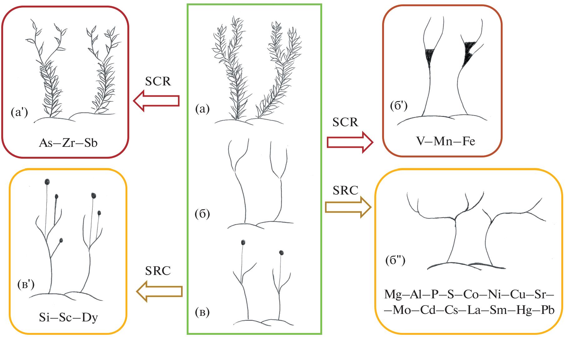 The territory of modern central Donbass is considered as an experimental site for the implementation of an ingredient biomonitoring program. Bryophytes were transplanted and exposed in the geolocalities of the direct impact of enterprises of coal mining and processing complexes, metallurgical and chemical industries, ruderal and residential ecotopes. For bryobionts with a wide amplitude of resistance to technogenic pollution (Amblystegium subtile (Hedw.) Schimp., Brachythecium campestre (Müll.Hal.) Bruch et al., Bryum argenteum Hedw., Bryum caespiticium Hedw., Bryum capillare Hedw., Ceratodon purpureus (Hedw.) Brid and Pylaisia polyantha (Hedw.) Schimp.) the following criteria of anthropotolerance were selected: 1) elements accumulation function, 2) the ability to accumulate specific pollutants, 3) structural and functional reactions and manifestation of atypical morphogenesis (teratogenesis) of plant organisms and 4) shifts in the characteristics of the survival strategy of species in the conditions of deep transformation of the landscape systems of Donbass. Specificity of accumulation of Na, Mg, Al, Si, P, S, Cl, K, Ca, Sc, Ti, V, Cr, Mn, Fe, Co, Ni, Cu, Zn, As, Se, Br, Rb, Sr, Zr, Mo, Cd, Sb, I, Cs, Ba, La, Ce, Nd, Sm, Eu, Tb, Dy, Yb, Hf, Ta, W, Hg, Pb, Th, U in samples of indicator plants used as seasonal phytotest monitors to assess pollution of natural environments have been defined. With a radical violation of geochemical cycles in plant life support systems, cases of specific chlorosis and necrosis of point localization, hypo- and hypergenesis and deformation, as well as fasciation, prolification, dystopia, oligomerization of vegetative organs, features of the development of individual groups of cells in the integumentary and conformational tissues of the leaf apparatus of bryobionts have been recorded. The revealed abnormalities are used as a phyto-indication characteristic when conducting an express analysis of the level of technogenic stress in field diagnostics. The coefficients of biological absorption and technogenic concentration of elements in biosubstrates were calculated when assessing the geochemical contrast of the environment. The difference in the accumulative capacity of bryobionts for individual elements or their associative groups in various ectopes is defined. The related morphogenetic heterogeneity of the structure and elemental composition of plants is an individual case of compliance with V.I. Vernadsky's ideas of the concentration, information and environment-forming functions of living matter.