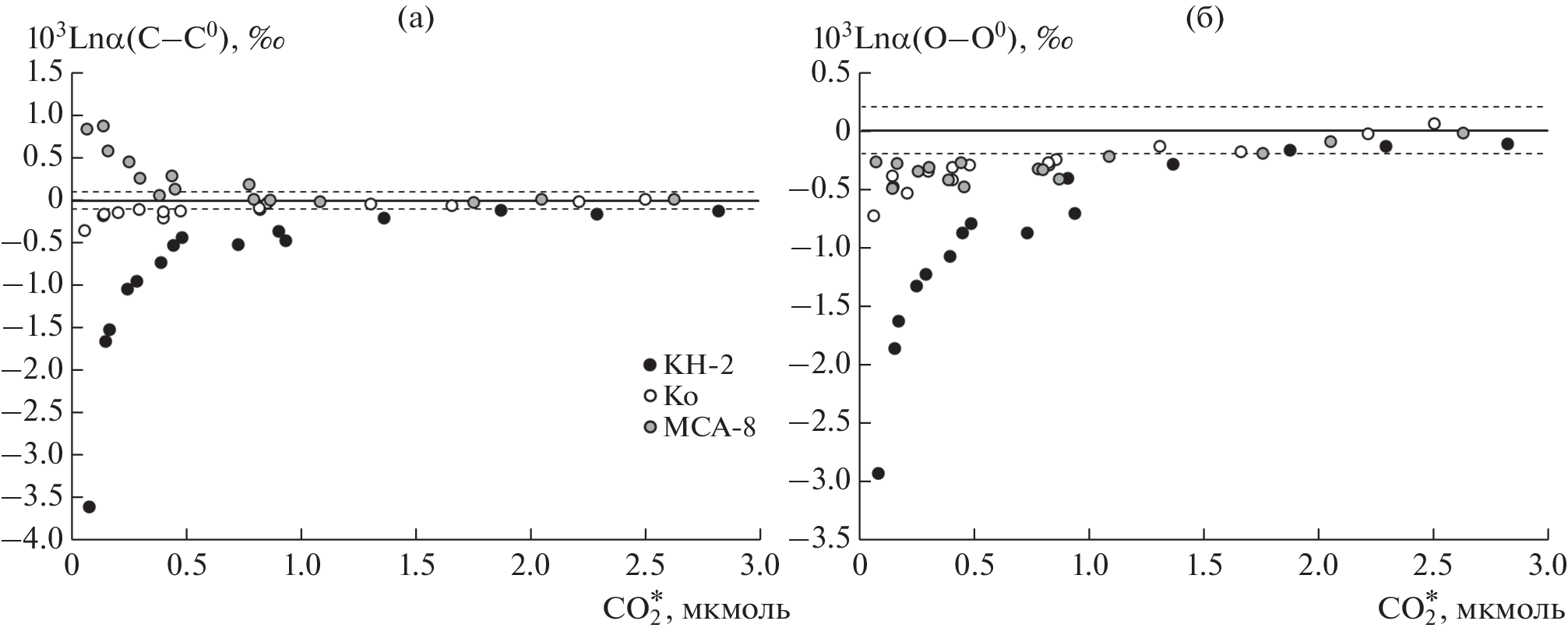 An experimental study of the main factors affecting the accuracy of oxygen and carbon isotopic analysis in carbonates dispersed in silicate matrix is carried out. Artificial 1, 2, 5, and 10% mixtures of quartz with carbonates with different isotopic parameters (KH-2, Ko, MCA-8) were analyzed by continuous flow isotope ratio mass spectrometry (CF IRMS). It is established that, in addition to the influence of the instrumental nonlinearity, the results are affected by two factors: trace amounts of CO2, constantly present in the system (the blank effect) and the presence of chemically neutral silicate particles (the matrix effect). The blank effect depends on the isotopic parameters of the sample and has very little influence on the estimated carbonate content in the rock. The matrix effect, on the contrary, strongly affects the estimated carbonate content, and produces the isotopic shift towards underestimated contents of heavy 13C and 18O isotopes. It is shown that this effect is related to the processes occurring near the CO2–acid–quartz interface, which are accompanied by kinetic fractionation of carbon and oxygen isotopes. Both effects are dependent on the amount of silicate matrix in the system and most clearly manifested during analysis of carbonate-poor rocks. When the carbonate content in the rock is about 1–2%, deviations from the true δ13C and δ18O values can reach the first ppm, while carbonate content obtained by chromatographic peak calibration can be underestimated by 20–40%.