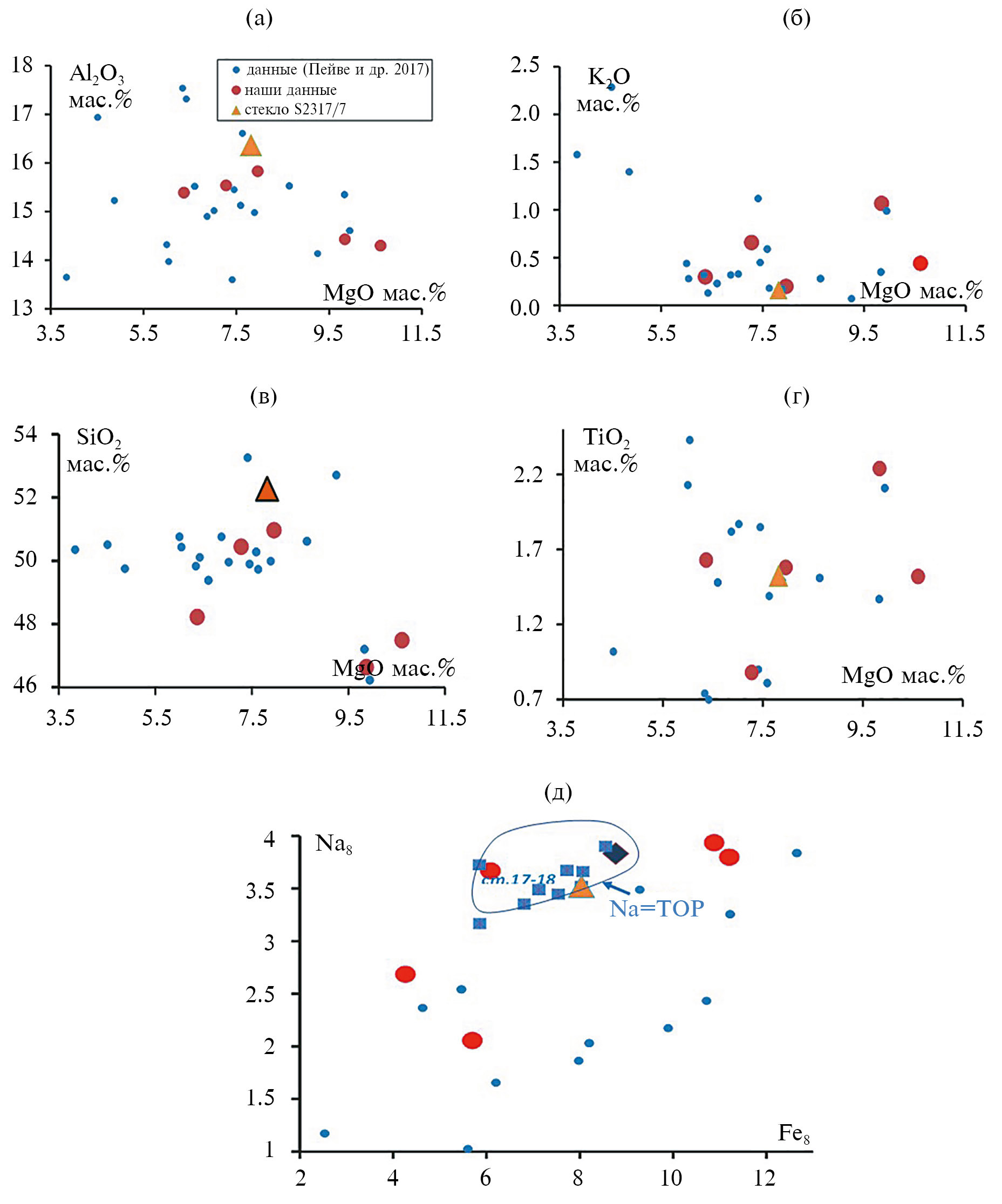 Приведенный на рис. 2 состав закалочного стекла (обр. S2317/7, табл. 1) идентичен слабо дифференцированному составу типичного толеита с содержанием MgO около 8 мас.% (табл. 1). Составы базальтов варьируют по содержанию калия (рис. 2б) от деплетированных (0.1) до обогащенных (более 1 мас% K2O), отражая присутствие разных по обогащенности первичных расплавов. Пересчитанные концентрации Fe, Na (Fe8 = FeO+1.664*MgO-13.313; Na8 = NaO +0.373*MgO –2.98) в базальтах на 8 мас.% MgО (рис. 2д) соответствуют уровню их содержания в первичных расплавах (Klein, Langmuir, 1987). Этот состав отражает этап до начала кристаллизации клинопироксена (на уровне 8 мас.% MgO), следующего за оливин-плагиоклазовой ассоциацией. При этом различный уровень концентраций Na в первичных расплавах сохраняется, образуя параллельные тренды при малоглубинной кристаллизации.