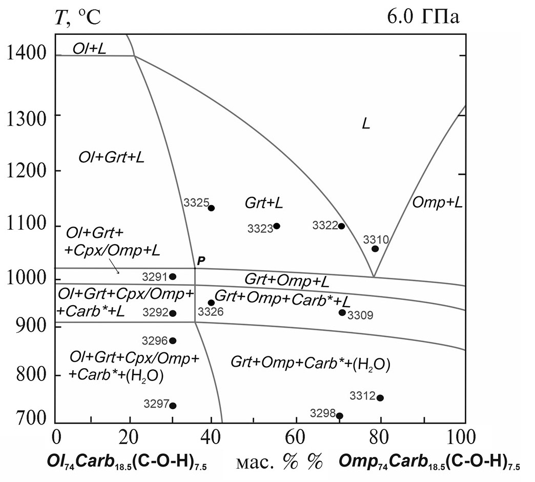 Влияние сверхкритического С-О-Н-флюида на ультрабазит-базитовую эволюцию алмазообразующей системы. Фазовые отношения при плавлении алмазообразующей системы Ol-Jd-Di-(реакционный Grt)-MgCO3-FeCO3-Na2CO3-CaCO3-(C-O-H флюид) экспериментально изучены в ее политермическом сечении Ol74Carb*18.5(C-O-H)7.5 – Omp74Carb*18.5(C-O-H)7.5 при 6 ГПа (рис. 2). Специфическая деталь в том, что перитектический состав в политермическом сечении данной многокомпонентной системы представлен короткой моновариантной линией параллельно оси температур. Вдоль нее осуществляется перитектическая реакция в согласии с правилом фаз Райнза (Rhines, 1956). Соответственно, пограничные моновариантные котектики, как ультрабазитовая Ol+Grt+Cpx/Omp+L, так и базитовая Grt+Omp+L, изображаются узкими дивариантными полями.