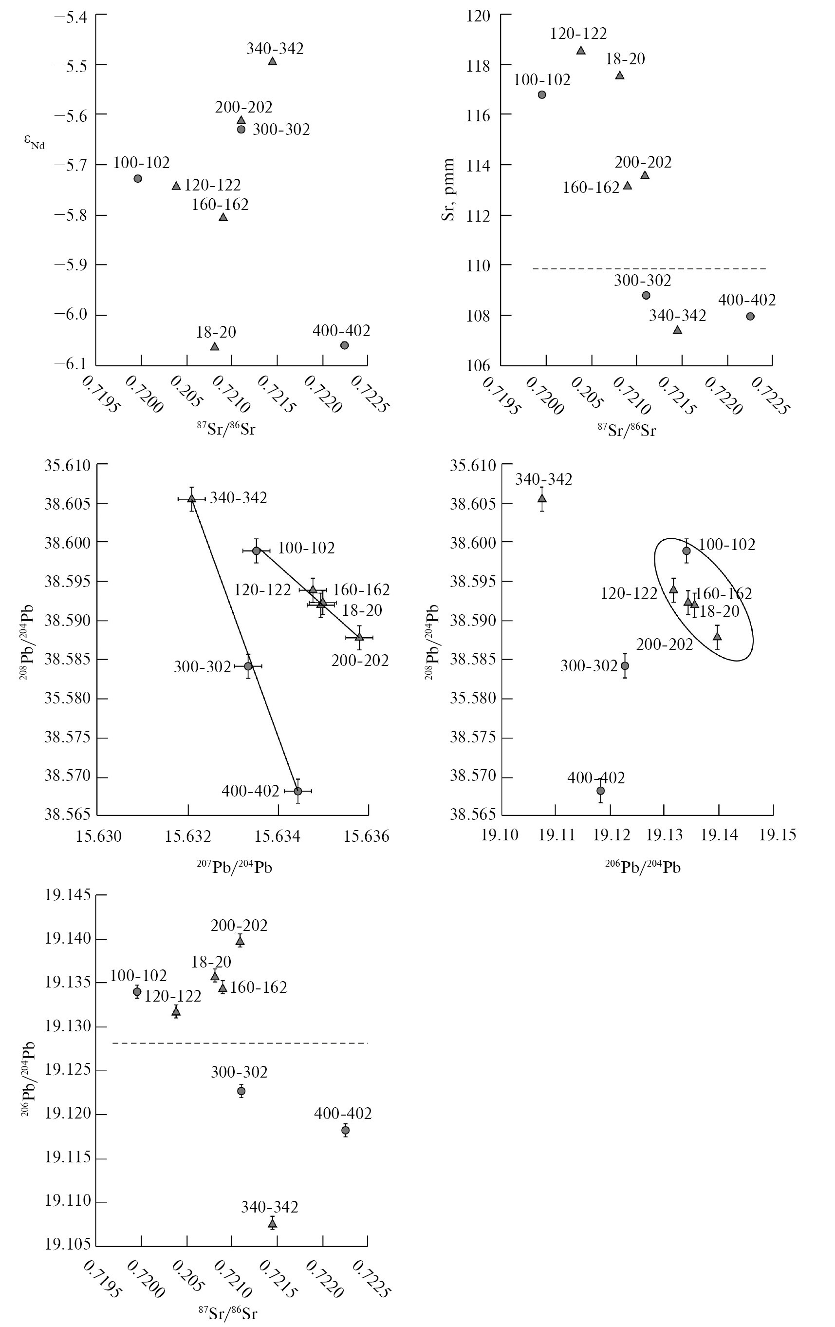 Рис. 3. Диаграммы парных соотношений изотопных составов Sr, Nd, Pb и содержания Sr для пород из залива Ога. Пунктиром отмечена предполагаемая граница между нижней и верхней частью разреза, эти же подразделения отмечены линиями тренда и овалом. Кружками обозначены образцы из теплых стадий, треугольниками – из холодных, цифры на графиках – номера проб, погрешность измерения (±2σ) обозначена горизонтальными и вертикальными рисками, там, где знака нет, она не превышает размер знака.