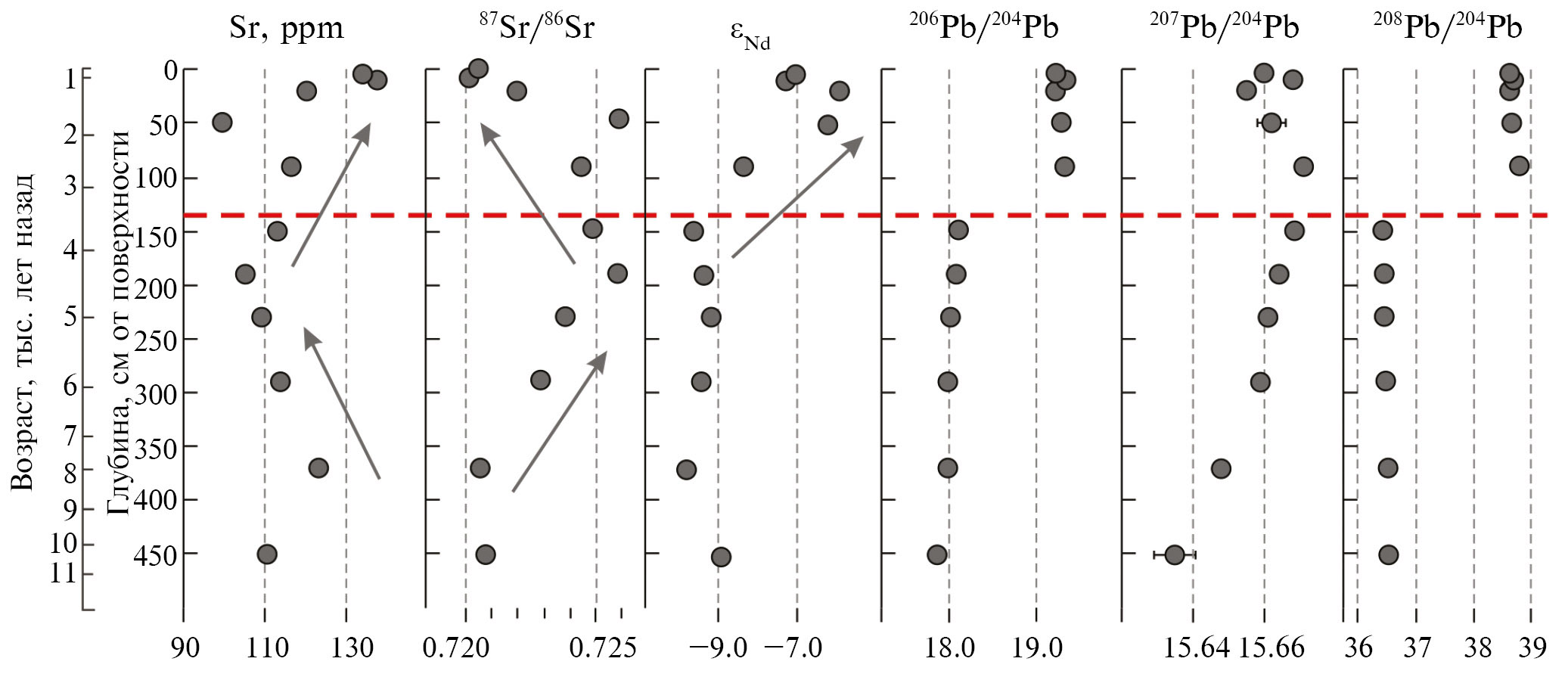 Рис. 4. Распределение содержания Sr и изотопных составов Sr, Nd, Pb по колонке АМК-5251 (залив Цивольки). Стрелками показаны тренды изменения составов, пунктирной линией – граница смены источника сноса. Погрешность измерения (±2σ) обозначена горизонтальными рисками в тех случаях, когда она превышает размер знака.