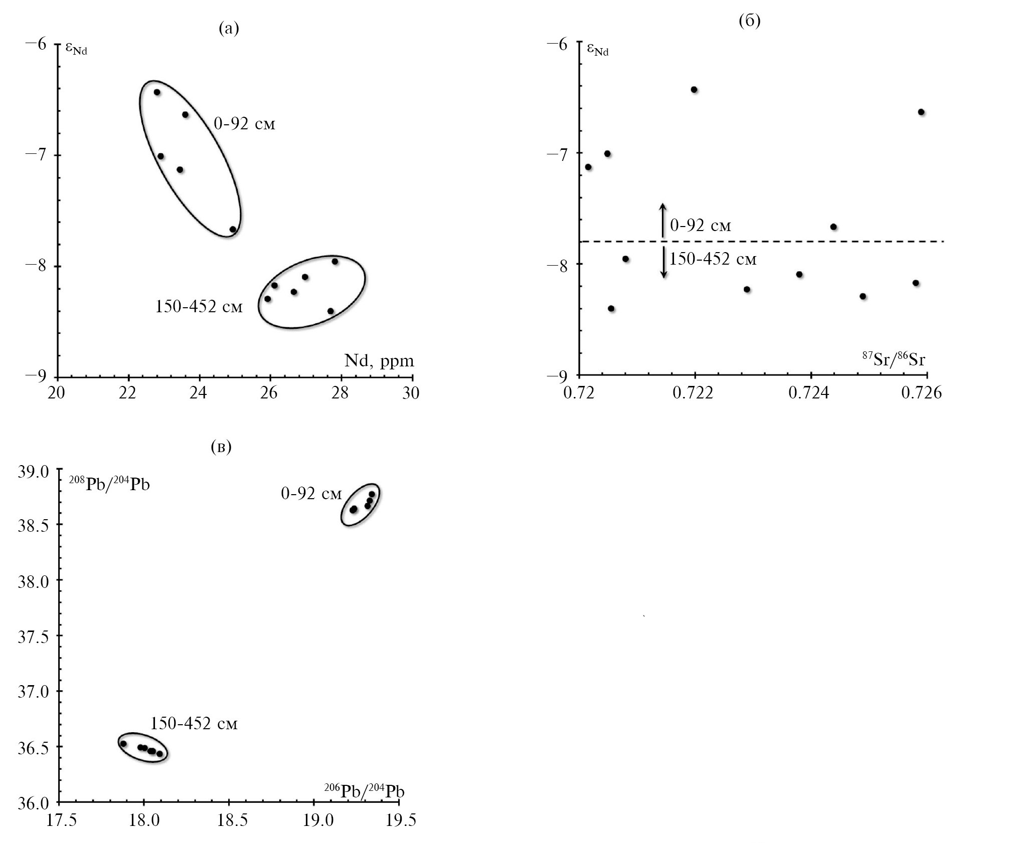 Рис. 5. Положение образцов из залива Цивольки в координатах (а) содержание Nd–εNd, (б) 87Sr/86Sr–εNd (пунктирной линией разделены горизонты, расположенные выше и ниже границы предложенных в тексте подразделений), и (в) 206Pb/204Pb–208Pb/204Pb. На графиках видно, что осадки верхней и нижней части разреза занимают различные поля. Это отчетливо указывает на смену пород в источнике сноса.