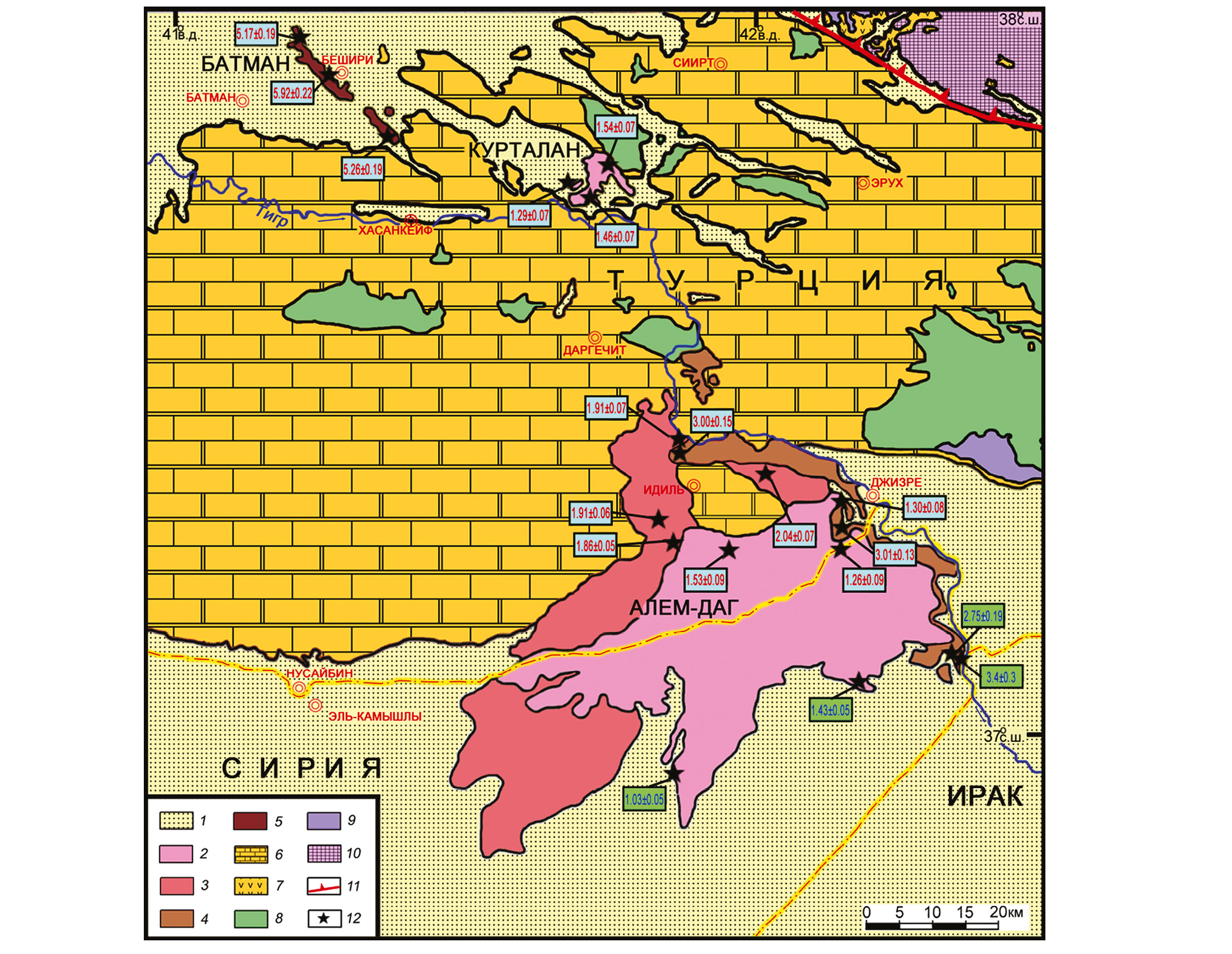 Изученные базальтовые вулканические ареалы, с севера на юг – Батман, Курталан и Алемдаг, расположены к югу от сутурной зоны Битлис в пределах фронтальной части Аравийской литосферной плиты (рис. 1, 2).
