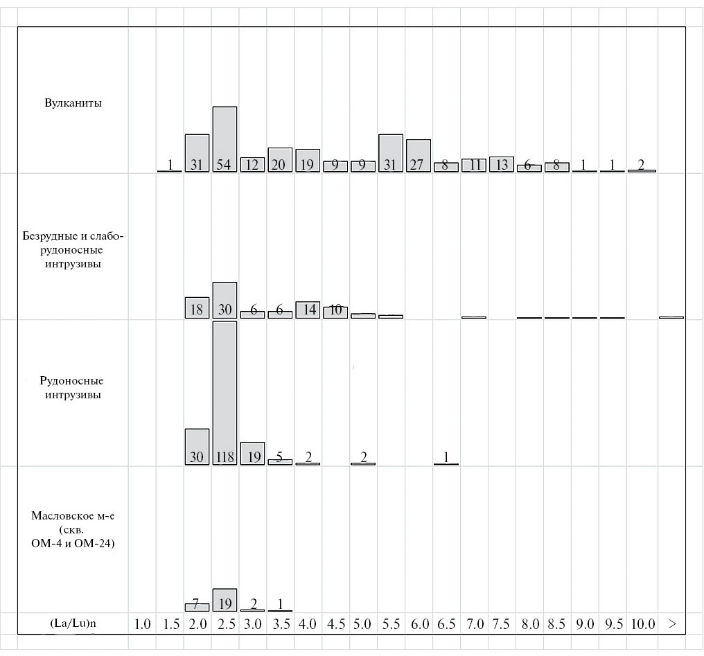 Рис. 8. Гистограммы нормированных (La/Lu)n отношений в вулканических породах, безрудных и рудоносных интрузивных телах, включая промышленные гиганты Талнах, Норильск–1 и Хараелах в сравнении с результатами анализа образцов габбро Масловского месторождения по данным настоящей работы. Источники данных см. на (рис. 9).