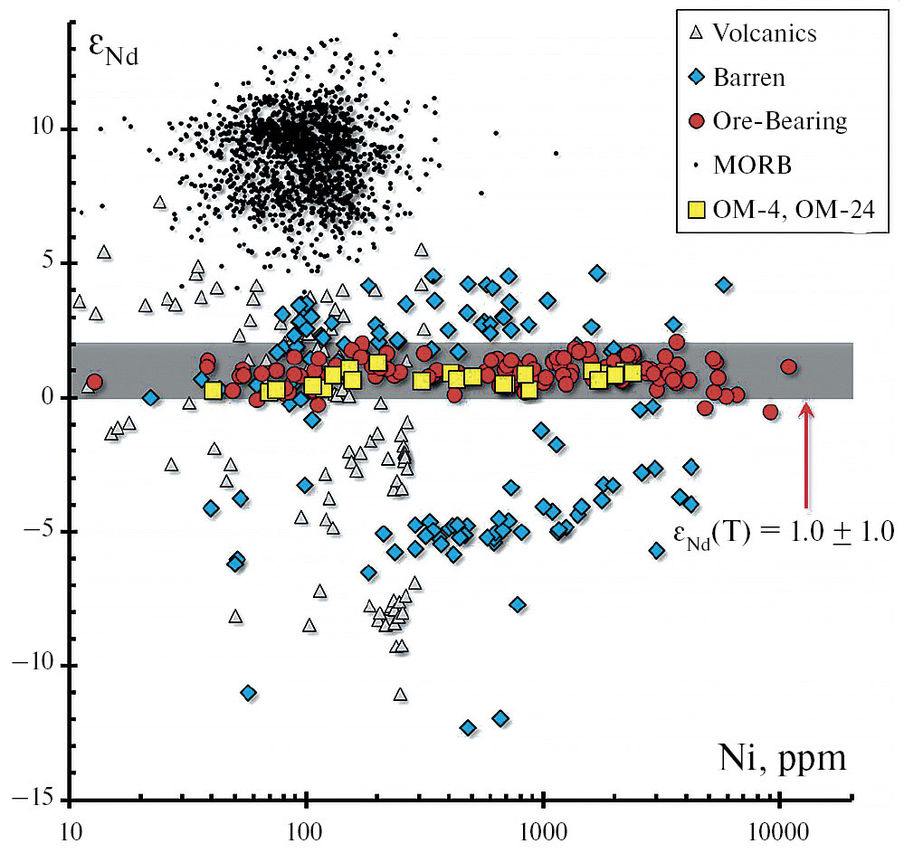Рис. 12 показывает, что в рудоносных магматических породах при широких вариациях содержания рудного элемента никеля изотопный состав неодима остается гомогенным в пределах εNd(T) = 1.0 ± 1.0 и признаки какой-либо корреляции между этими параметрами отсутствуют. Это наблюдение определенно указывает, что в процессе накопления рудных компонентов не происходила контаминация расплава изотопно-аномальным (коровым?) веществом, изотопно-геохимические признаки ассимиляции отсутствуют. Этот же вывод можно распространить и на другие рудные компоненты месторождения Норильского комплекса, т.к. в этих породах имеет место сильная корреляция между никелем, медью и элементами платиновой группы (рис. 7).