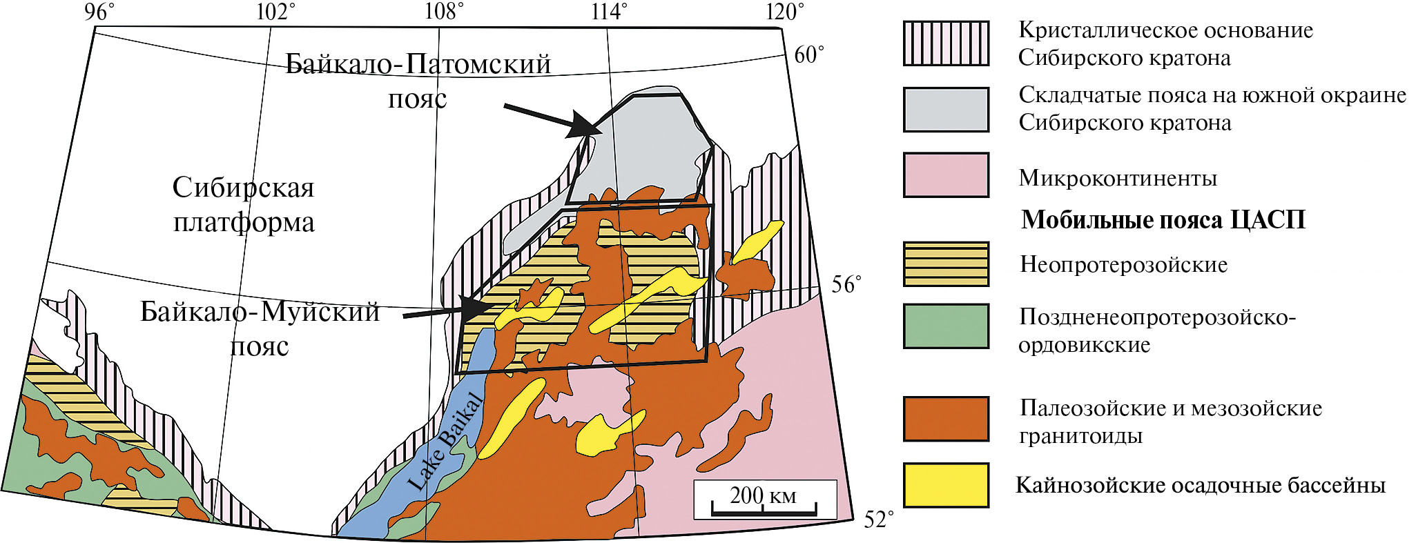 Байкало-Муйский складчатый пояс (БМП) расположен к югу от Байкало-Патомского пояса. Он выделяется в составе северо-восточной части Центрально-Азиатского орогенного пояса (ЦАОП) — крупной аккреционно-коллизионой структуры, имеющей протяженность около 5 тыс. км и характеризующаяся длительной историей развития (от неопротерозоя до мезозоя) (Ярмолюк и др., 2012; Добрецов и др., 2013; Kröner et al., 2014; Safonova et al., 2017). Байкало-Муйский складчатый пояс состоит из разнородных блоков докембрийской коры, интенсивно переработанной в каледонский и герцинский этапы развития ЦАОП. С запада и востока БМП граничит через систему надвиговых и сдвиговых тектонических зон с выходами докембрийского основания Сибирского кратона. С юга он соседствует с Баргузино-Витимским супертеррейном, образованного неопротерозойскими и раннепалеозойкими блоками континентальной коры, интенсивно переработанными в позднепалеозойское время (Добрецов, 1983; Рыцк и др., 2007а; Зорин и др., 2009; Ярмолюк и др., 2012; Kröner et al., 2014; Ярмолюк, Дегтярев, 2019).