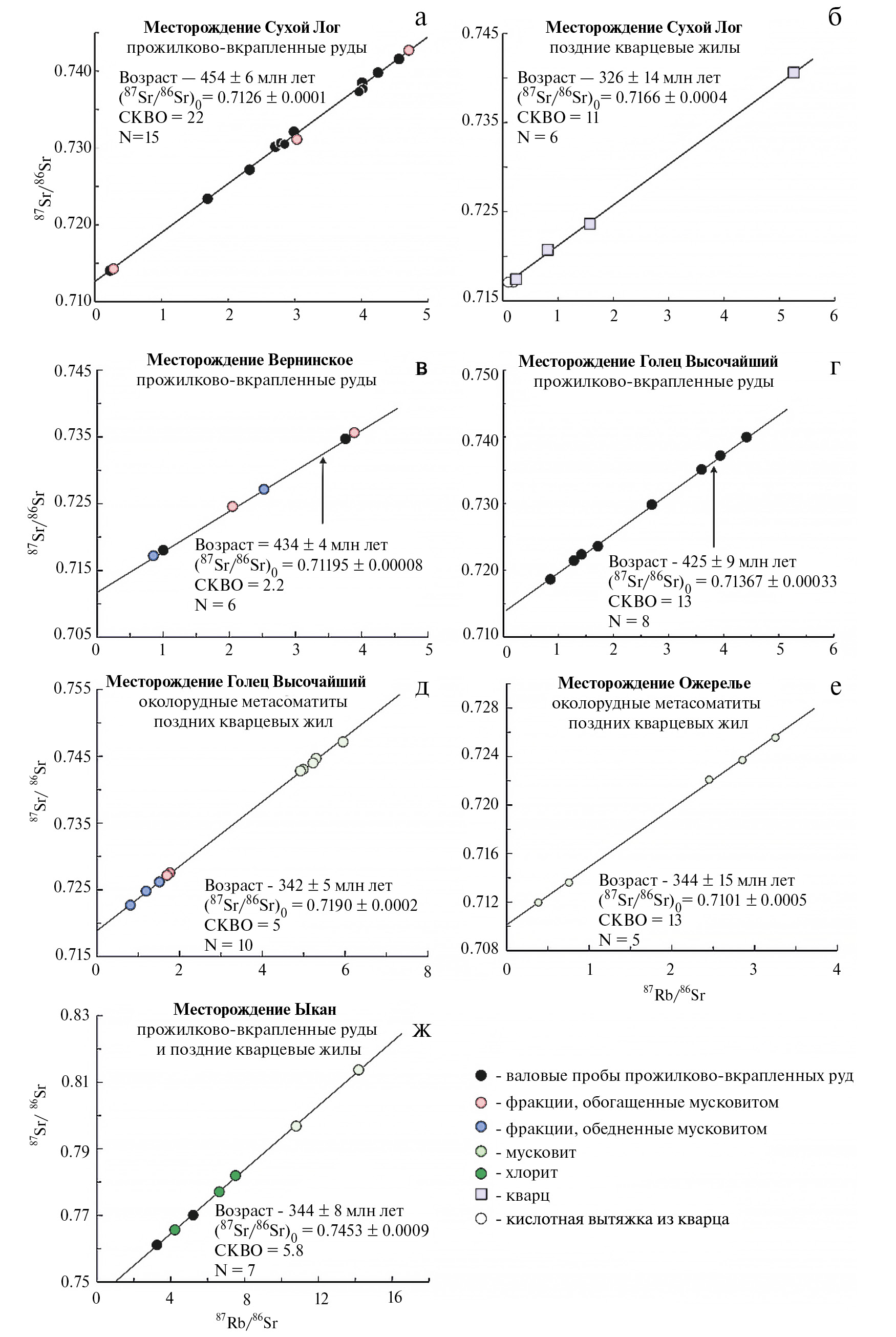 Орогенные месторождения золота присутствуют в большинстве известных металлогенических провинций России. Наиболее древние (палеопротерозойского возраста) небольшие по своему масштабу месторождения и рудопроявления (например, Талловейс, Фаддейн-Келья, Майское) известны в архейских зеленокаменных поясах Карело-Кольской провинции (Сафонов и др., 2003; Ларионова и др., 2013). Месторождения неопротерозойского возраста находятся на территории Енисейского Кряжа Саяно-Енисейской золоторудной провинции, ресурсный потенциал которой оценивается примерно в 1500 т золота. Здесь помимо месторождения Олимпиада, также известны крупные и средние месторождения орогенного типа: Эльдорадо, Советское, Благодатное и Ведуга (Чугаев и др., 2001; Гибшер и др., 2019; Sazonov et al., 2020). В этой же провинции в Восточном Саяне находится крупное месторождение Зун-Холбинское (Константинов, 2010в; Гордиенко и др., 2016; Томиленко и др., 2018; Damdinov et al., 2022; Чугаев и др., 2024). В пределах Уральской провинции, для которой основные ресурсы (≥2000 т, Au) связаны с магматогенными (колчеданными и мезотермальными) месторождениями (Сазонов и др., 1999; Vikentyev et al., 2021), известны многочисленные, как правило, мелкие позднепалеозойские золото-кварцевые месторождения, расположенные вблизи или непосредственно в зоне Главного Уральского разлома в тектонизированных и метасоматизированных породах различного состава и возраста. Среди них, например, месторождения Ганеевское, Орловское, Среднеубалинское, Малый Каран и Миндяк (Знаменский, Знаменская, 2011; Знаменский и др., 2015; Чугаев, Знаменский, 2018). Мезозойские орогенные месторождения золота представлены в нескольких провинциях России. В Буреинско-Ханкайской (Монголо-Охотский пояс) провинции расположены, например, раннемеловые месторождения Маломыр, Токур, Угличкан и Эльгинское (Goldfarb et al., 2014; Кадашникова и др., 2022; Sorokin et al., 2023), золото-кварцевая минерализация которых локализована среди метаосадочных пород. В Верхоянской провинции (Верхоянский складчато-надвиговый пояс) находятся упомянутое выше суперкрупное месторождение Нежданинское с возрастом около 130 млн лет, а также несколько более мелких раннемеловых месторождений и рудопроявлений, например, Булар, Кузминична, Дуэт, Юр и Финн (Гамянин и др., 2000; Гамянин, 2001; Горячев, 2003; Nokleberg et al., 2005; Бортников, 2006; Бортников и др., 2007; Чугаев и др., 2010b; Чернышев и др., 2018). К ним по возрасту близки орогенные месторождения в Яно-Колымском поясе. К их числу относятся суперкрупное месторождение Наталкинское и крупное месторождение Кучус, а также меньшие по своим масштабам оруденения месторождения Хангалас, Школьное и Ветренское (Goldfarb et al., 2014; Савчук, Волков, 2019; Kudrin et al., 2021).