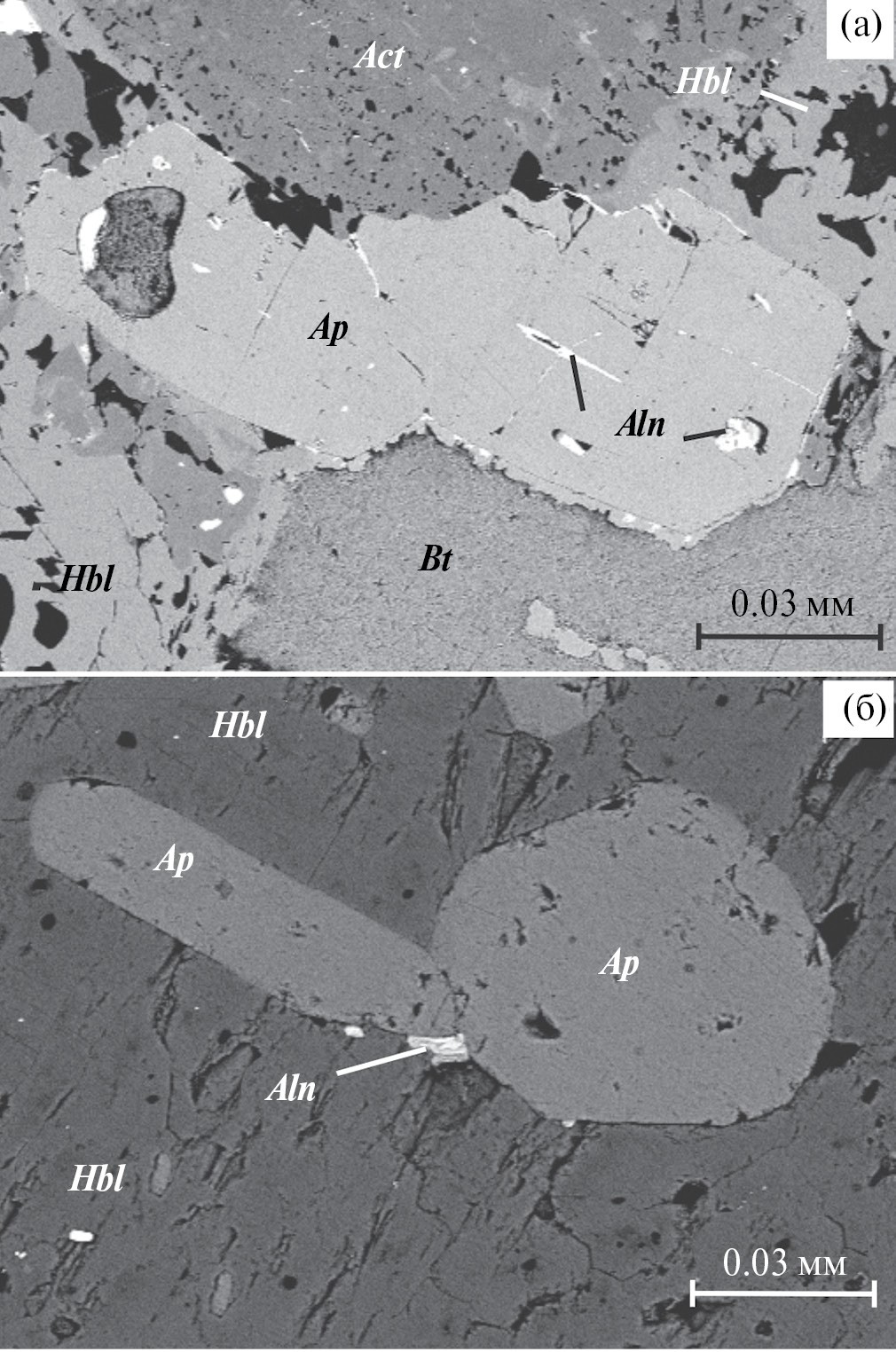 Одним из признаков перекристаллизации апатита является наличие в нем включений РЗЭ-содержащих минералов – монацита, ксенотима, алланита, образование которых можно связать с высвобождением РЗЭ в собственную фазу в ходе метасоматоза или метаморфизма (Harlov, 2015). Присутствие включений алланита в зернах апатита или на границах зерен апатита с другими минералами в породах массива Велимяки может дополнительно свидетельствовать о новообразованном характере апатитовой минерализации (рис. 9).