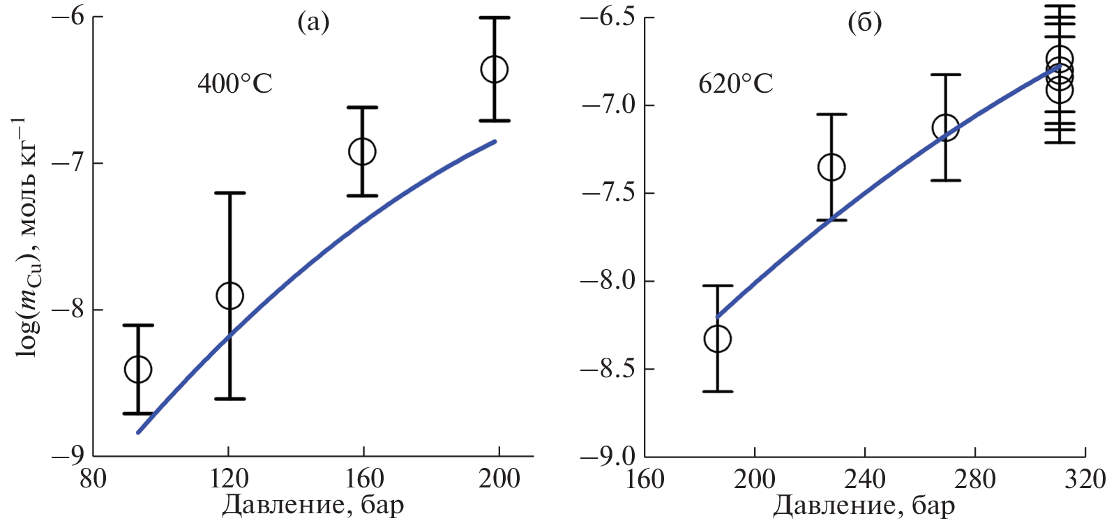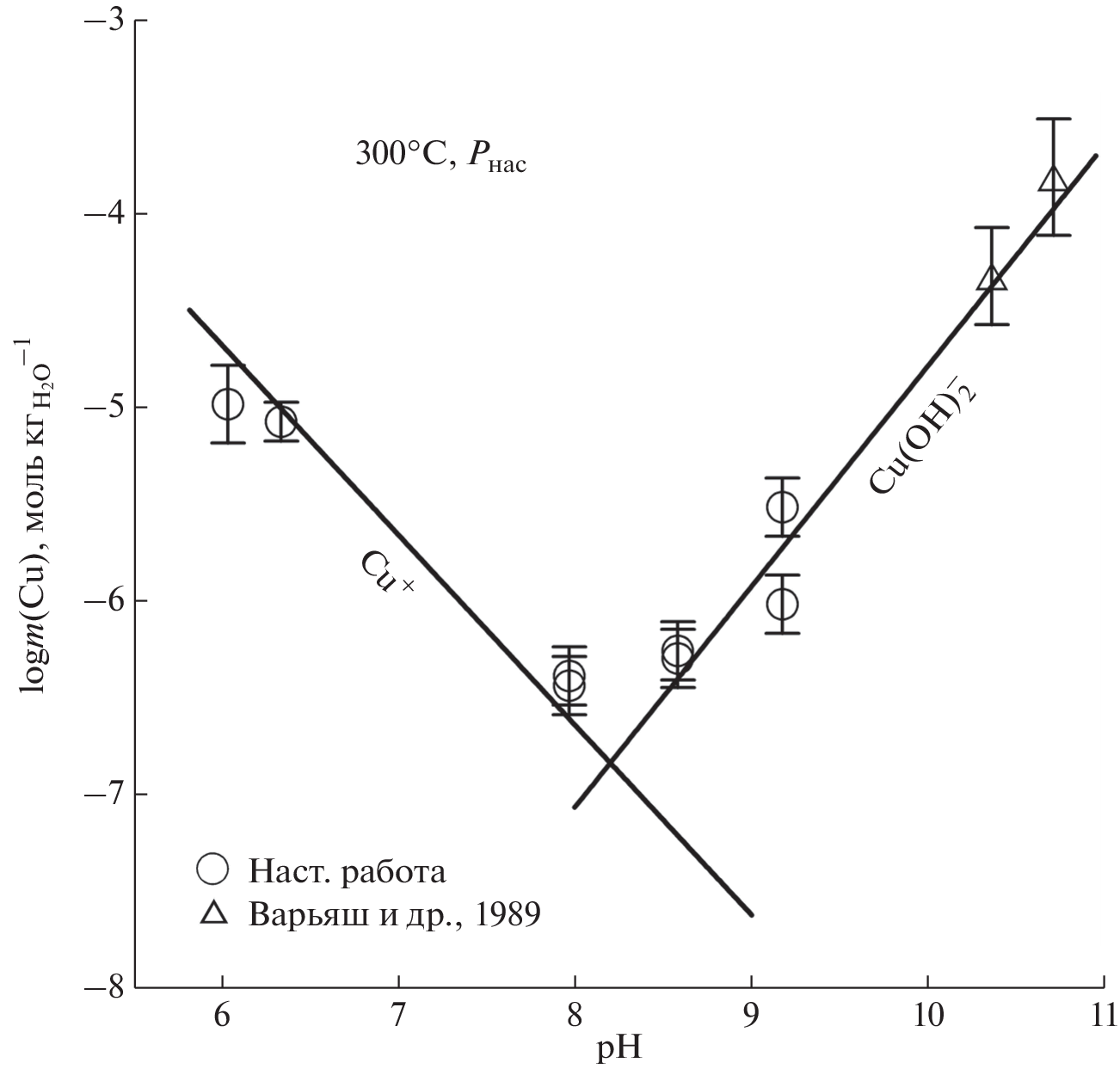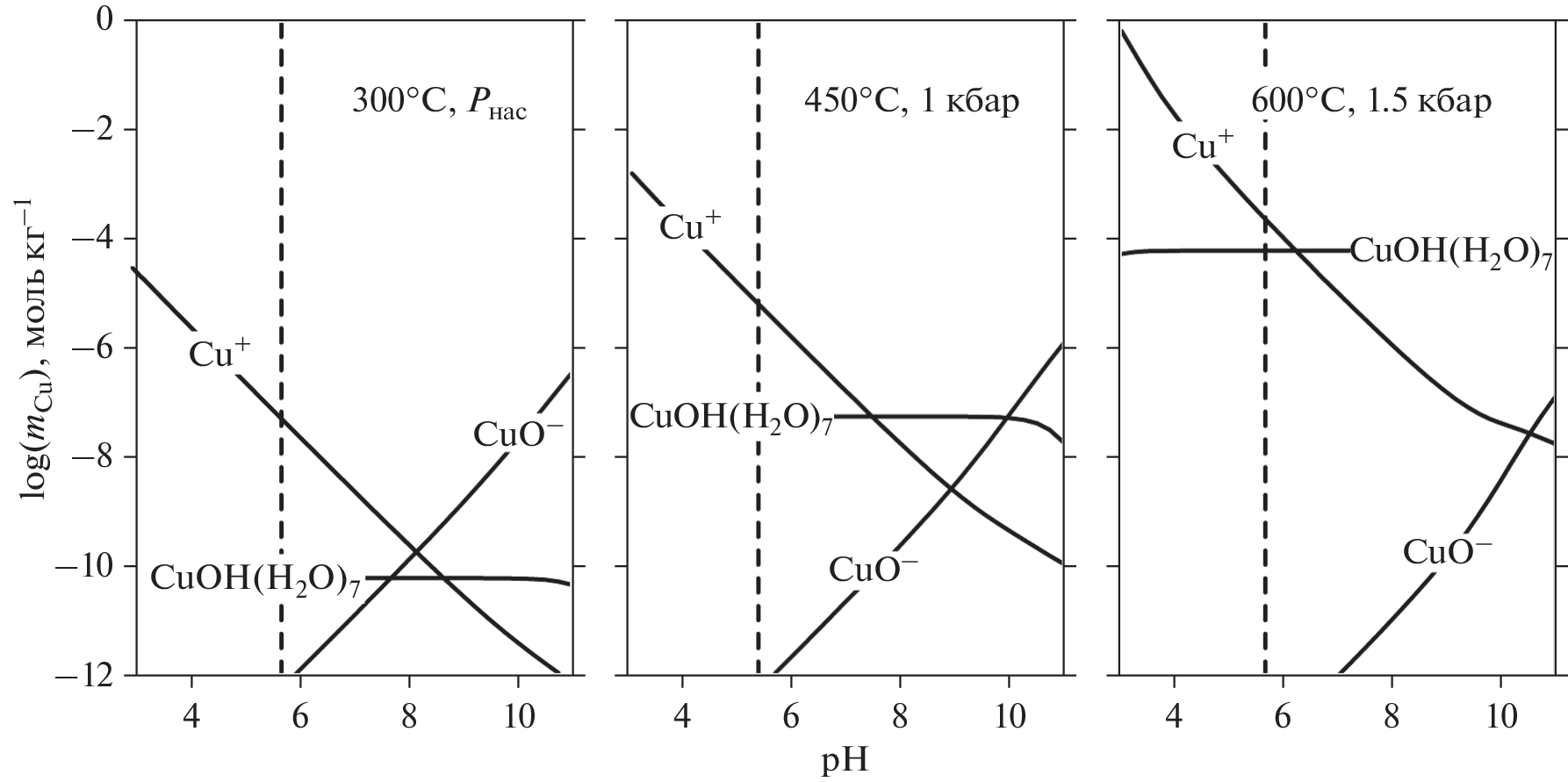 The experimental data available in the literature on the solubility of Cu(met.) and Cu2O (cuprite) in water under hydrothermal conditions have been processed. Key experiments were carried out on the solubility of cuprite at 300 C, saturated vapor pressure of H2O, vs. pH of the solution. As a result, a set of values of thermodynamic properties for 25°C, 1 bar and parameters of the HKF (Helgeson-Kirkham-Flowers) and AD (Akinfiev-Diamond) equation of states for Cu(I) hydroxocomplexes was obtained, which make it possible to describe their behavior in a wide range of temperatures (0 – 600 C), pressures (1 – 3000 bar) and densities of aqueous fluid (0.01 – 1 gcm–3). As it has been shown by thermodynamic modeling the Cu+ ion is prevalent in the acidic and weakly alkaline regions of the aqueous solvent over the entire temperature and pressure range studied. The effect of the neutral CuOH hydroxocomplex begins to show up in the alkaline region at T > 300 C and grows with increasing temperature. The second copper hydroxocomplex Cu(OH)2– shows up only in the strongly alkaline region, and the temperature has almost no effect on its behavior