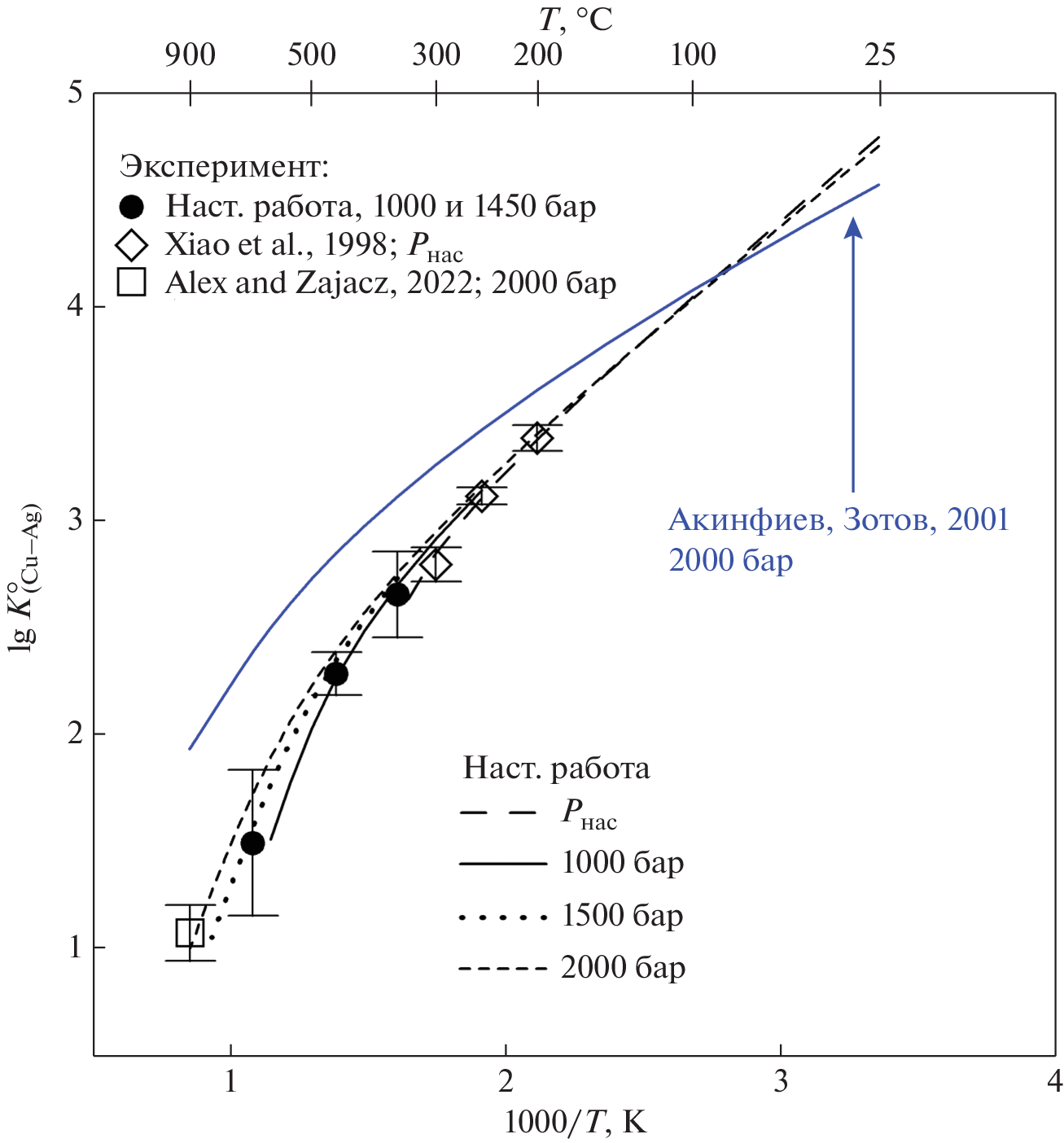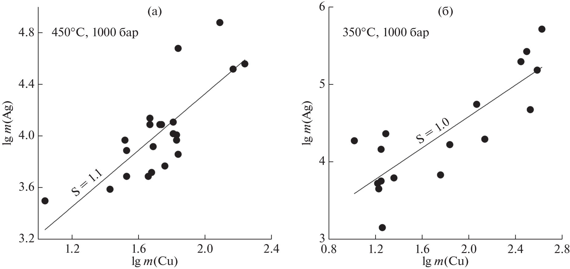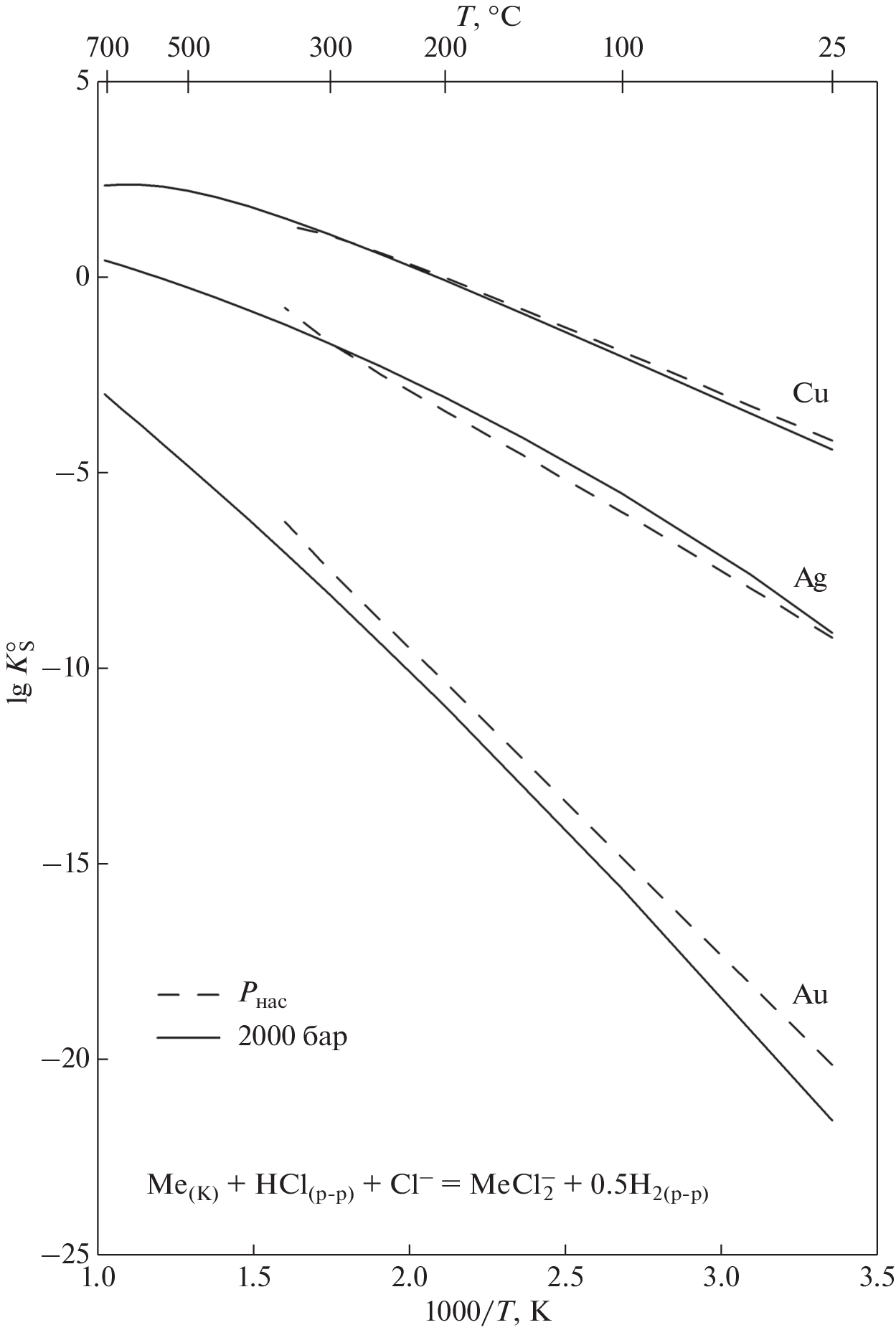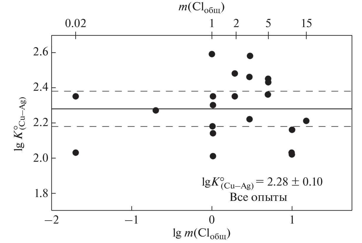 The calculated reaction constant is independent of chloride concentration. It is known that AgCl2- predominates in the studied chloride concentration range. Therefore, the main cupper form of occurrence is CuCl2- in all experimental fluids with chloride content up to 47 wt.%, which is close to the NaCl saturation limit. The constant of the coupled Cu and Ag solubility was determined for the experimental PT-parameters as lg K°(Cu-Ag) = 2.65±0.20 (350 °С/1000 bar), 2.28±0.10 (450 °С/1000 bar), 1.49±0.34 (653 °С/1450 bar). These data, together with values from the literature for temperatures from 200 to 900 °С and pressure up to 2000 bar were fitted to the density model equation: lg K°(Сu-Ag) = 1.066 + 1.108∙103∙T(K)-1 + 3.585lgd(w) – 1.443∙lg d(w)103T(K)-1, where d(w) is the pure water density. According to these data, copper is much more soluble in chloride solutions compared to silver, but the difference in the solubility decreases with the temperature increase. Reliable literature data on the silver solubility constant allow to calculate the copper solubility one