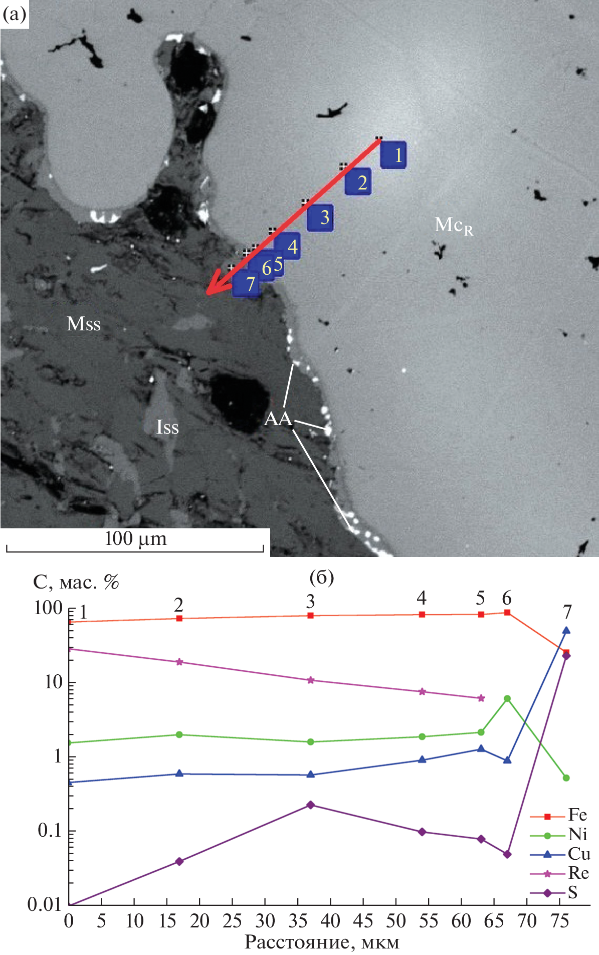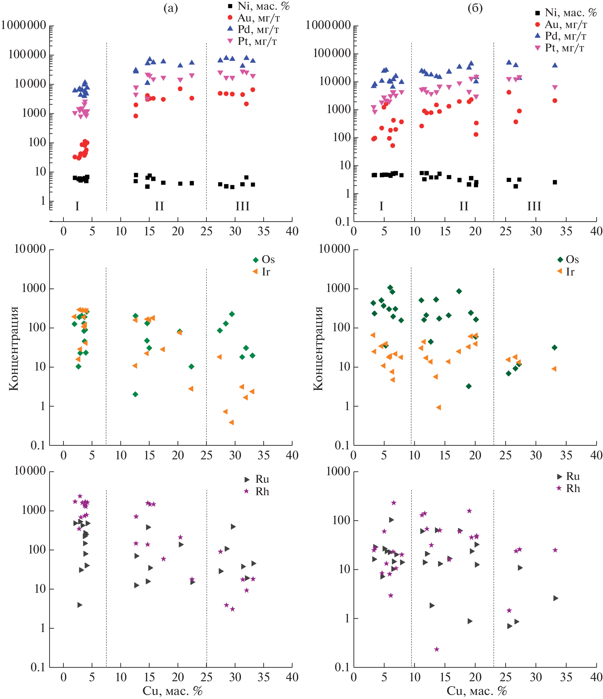 The results of an experimental study of the melting of a graphite-saturated Fe–Fe(CuNi)S–C system at 0.5 GPa and 1150–1250°С with the addition of impurity elements Ag, Au, Re, Pt, Pd, and Rh are presented. The quenched sulfide melt forms the matrix of the sample, at 1150–1200°С it is represented by the FeNiS pyrrhotite phase (Mss) with inclusions of the FeCuS phase (Iss) anomalously enriched in Cu. At 1250°С, the sulfide melt is quenched in the form of a homogeneous pyrrhotite Ms phase of the Fe(CuNi)S composition. The change in the Ms composition of the quenched sulfide melt by the two-phase Mss + Iss association is considered as evidence of the existence of supra-liquidus Mss and Iss stratification of the sulfide Fe–Ni–Cu melt in the range of 1150–1250°С. As a result of fractionation of elements between immiscible Fe-sulfide (Ms) and Fe-metal (Mc) melts, Fe, Ni, Pt, Re, Au are predominantly concentrated in the metal melt, while Cu, Ag are concentrated in the sulfide melt. The role of the supra-liquidus Mss–Iss liquation in the genesis of sulfide mineralization of the deposits of the Talnakh ore cluster, including pyrrhotite-chalcopyrite "drops" in picritic gabbro-dolerites, as well as pyrrhotite and chalcopyrite types of ores of zonal sulfide deposits, is discussed. The role of Ms and Mc separation of the Fe-sulfide melt during carbon contamination in the Cu–Pd specialization of magmatic sulfide deposits of the Norilsk region is considered.