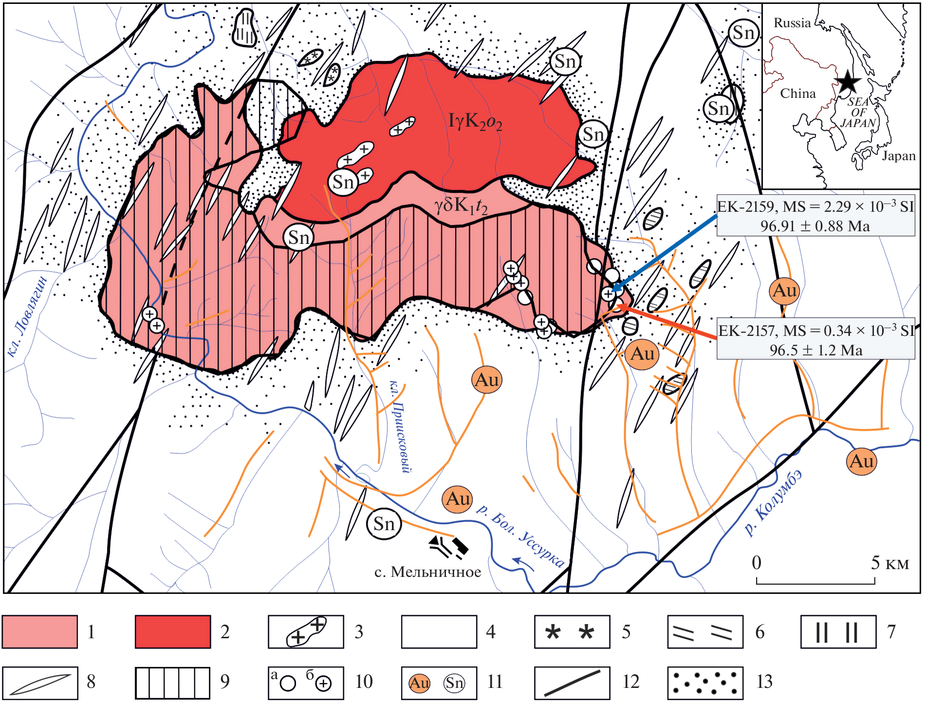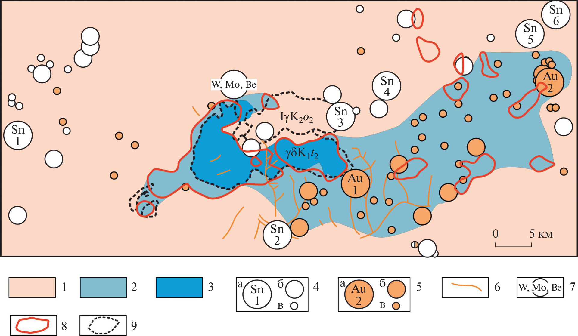 The same Cenomanian (96.91 ± 0.88 and 96.5 ± 1.2 Ma) age of amphibole granodiorites of the magnetite and ilmenite series in the southern part of the Priiskovy massif has been established. Among the relatively homogeneous central ilmenite zone of the Sikhote-Alin orogenic belt, the local occurrence of magnetite rocks of the Priiskovy massif explains the distribution of deposits and ore occurrences of the studied site. All deposits and ore occurrences of tin within the boundaries of the Priiskovy massif are located in the zone of distribution of rocks of the ilmenite series (reducing conditions), and deposits and placers of gold and manifestations of polymetallic mineralization are located in the zone of rocks of the magnetite series (oxidizing conditions)