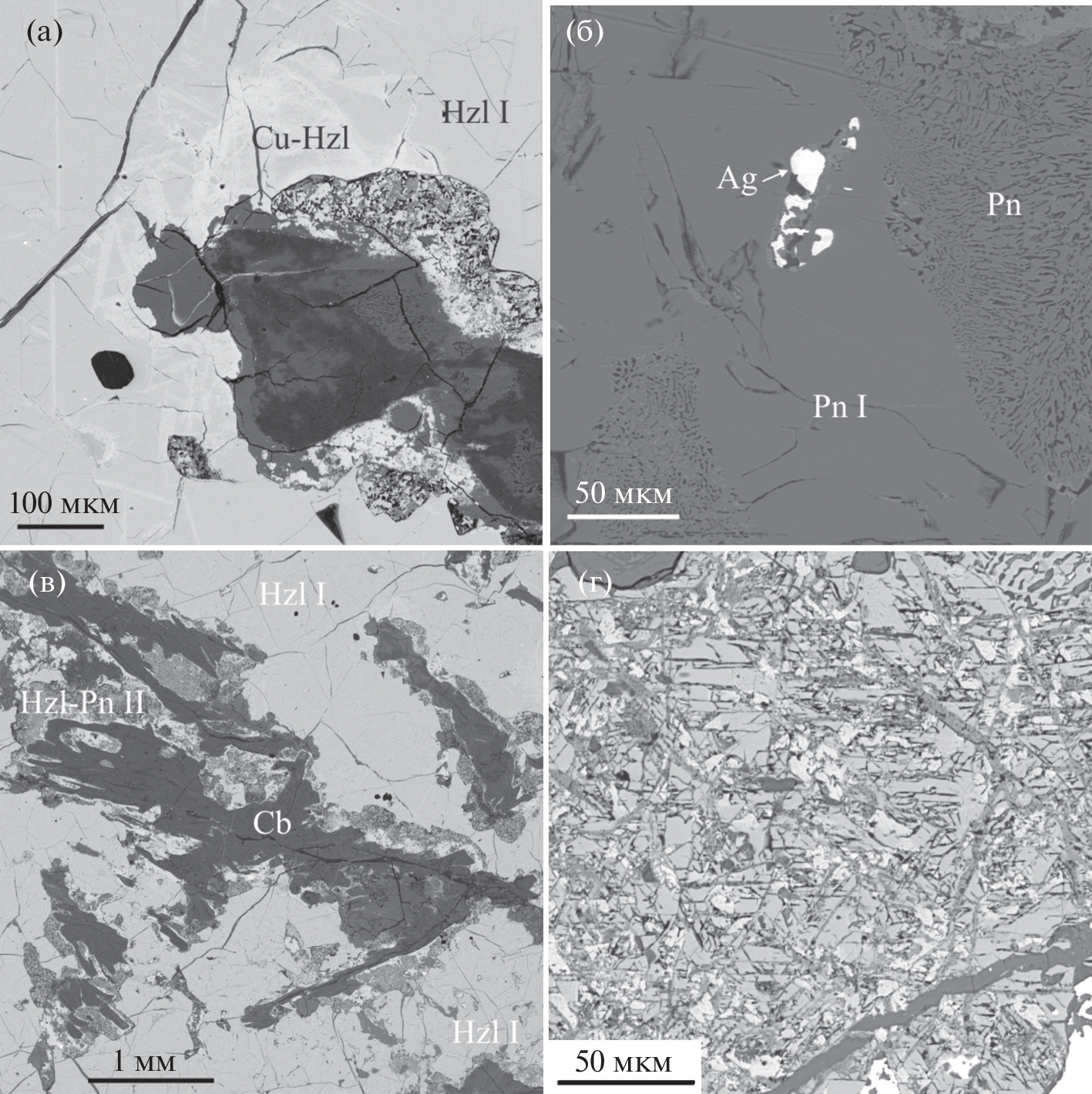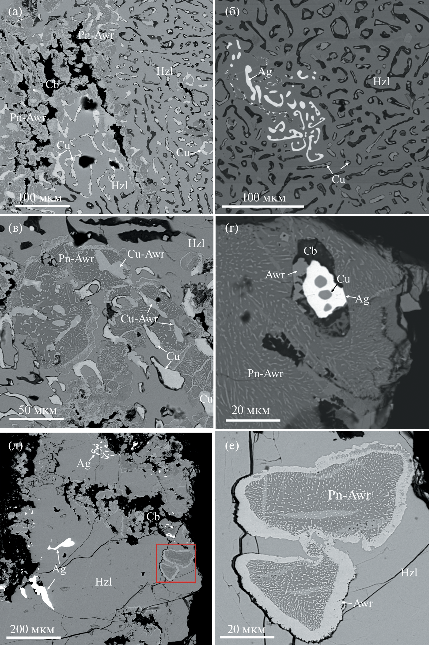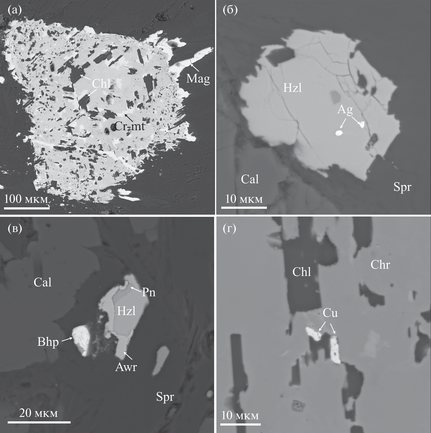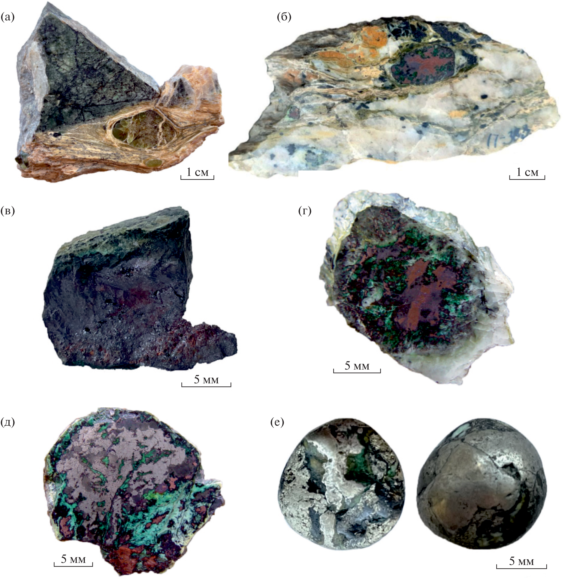 Polymineral aggregates of rounded shapes (“nodules”) composed of native and sulfide minerals of Cu, Ni, Fe, Ag, and other elements from vein magnetite–calcite–chrysotile rocks with jewelry demantoid in the Korkodinskoe hypermafic massif are described. A common feature of the six identified types of native sulfide nodules, composed of native copper, heazlewoodite, pentlandite, cuprite, and other native sulfide minerals, is their spheroidal shape, which makes them similar to individual grains of other gangue minerals (calcite, magnetite, etc.). In heazlewoodite–pentlandite nodules, specific symplectites of mercuric silver and nickel copper in heazlewoodite, as well as awaruite in Co–pentlandite, were found. The matching set of ore minerals in the host serpentinite vein mass (native copper, mercuric silver, heazlewoodite, pentlandite, awaruite) and nodules from the vein material indicates their genetic connection and the conjugation of demantoid mineralization with the evolving processes of serpentinization. It was established that the nodules formed at temperatures below 380°C under reducing conditions at very low sulfur fugacity values (10–17–10–27 bar) and oxygen (10–30 bar at 200°C to 10–21 bar at 350°C). For heazlewoodite–pentlandite nodules, such conditions persisted throughout the entire time of their formation, while, for other nodules, the reducing conditions of early parageneses were replaced by oxidative conditions in late parageneses, which is recorded by the replacement of native copper with cuprite. It is assumed that the features of the morphology and structure of native sulfide nodules and the presence of symplectite intergrowths of ore minerals in them are associated with specific conditions created during the decompression of the crust-mantle mixture rising to the surface in the fault zone. The source of the metals was a deep, high-temperature fluid interacting with mafic and ultramafic rocks under reducing conditions at a low water-to-rock ratio.