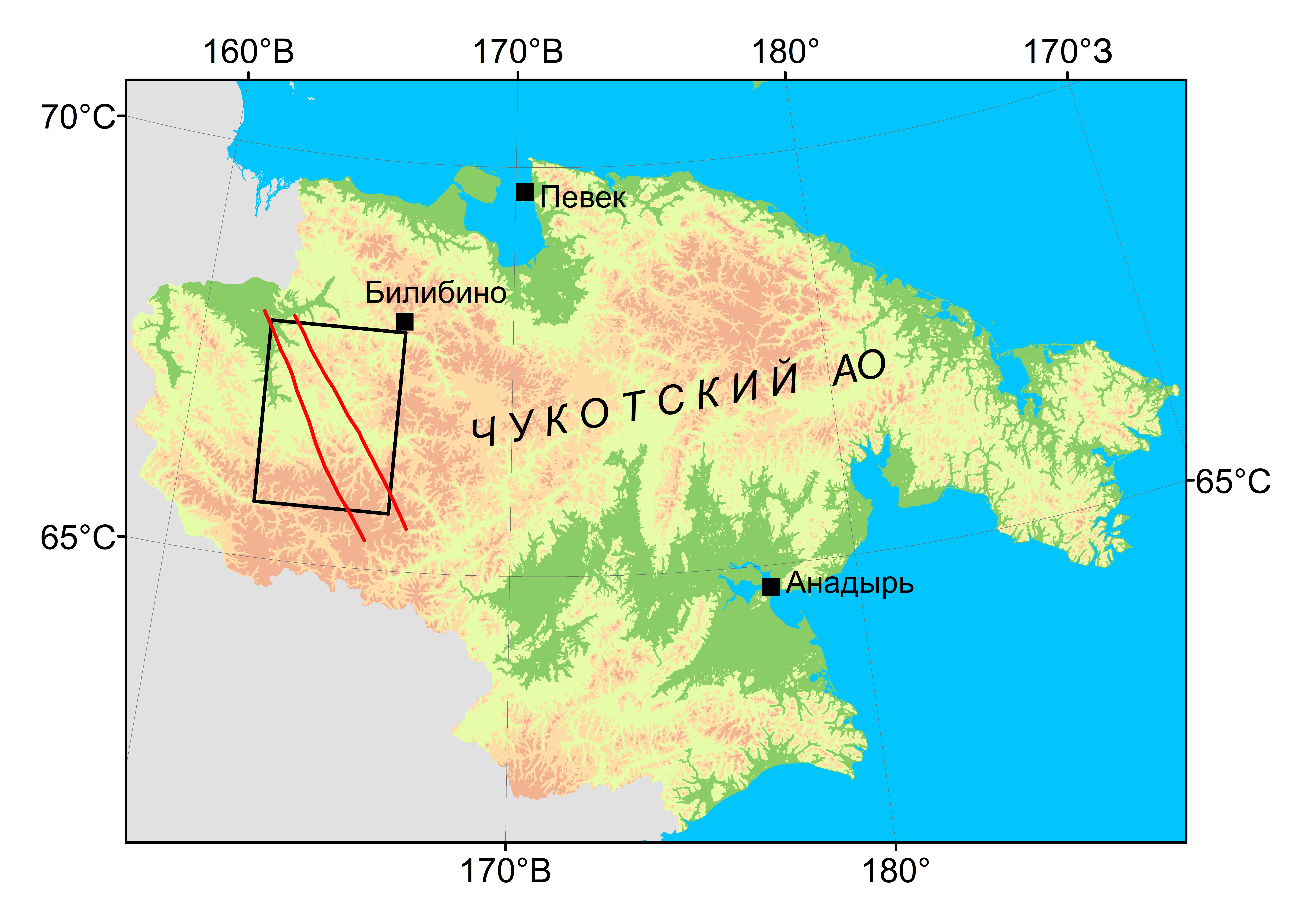 Фиг. 1. Географическое положение Баимской рудной зоны. Красными линиями показан контур БРЗ, черный прямоугольник — контур геологической схемы на фиг. 2.