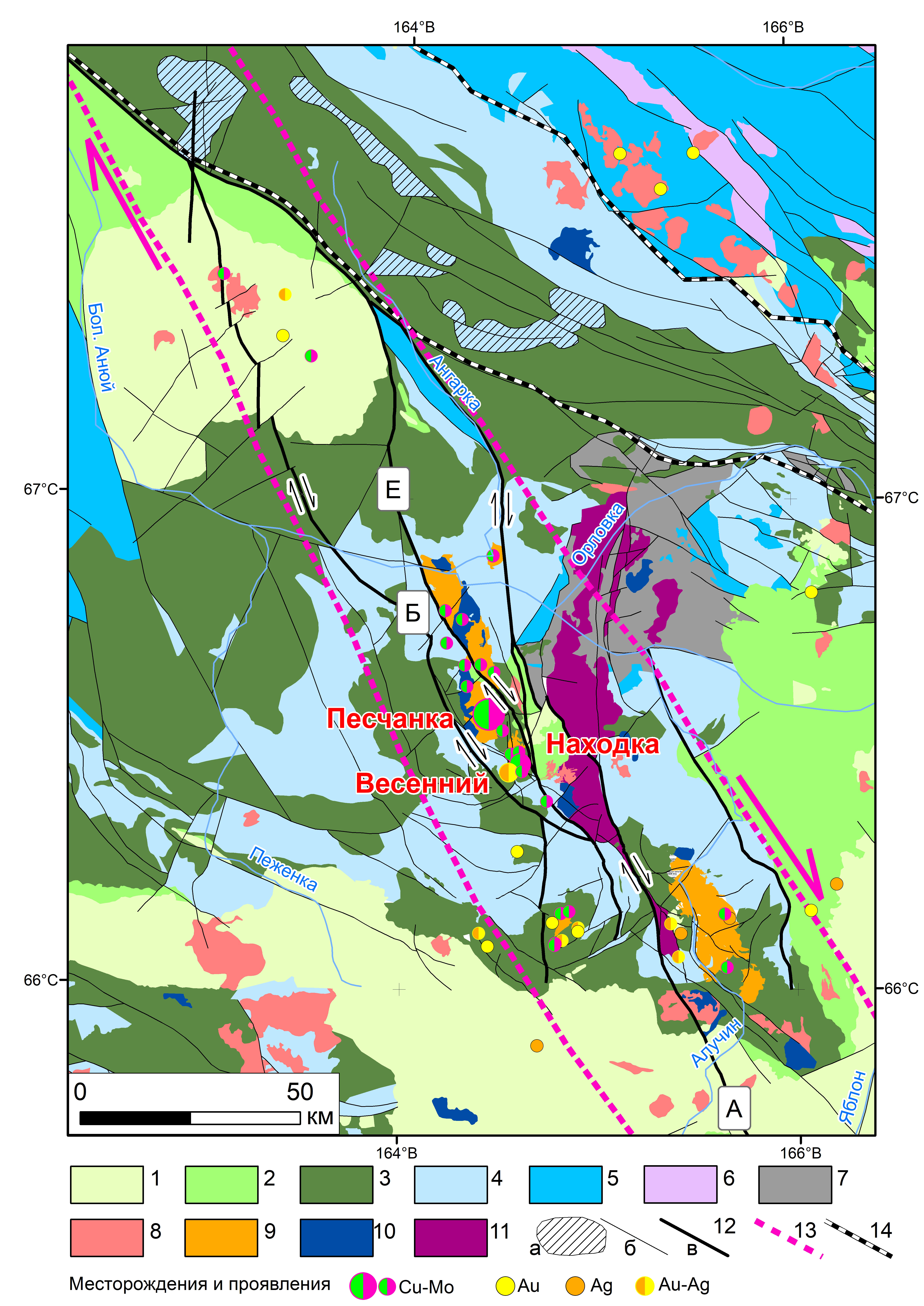 Фиг. 2. Схематизированная геологическая карта Баимской рудной зоны и ее обрамления. 1 — верхнеальбские вулканиты; 2 — верхнеаптские–нижнеальбские угленосные терригенные отложения; 3 — вулканогенно-терригенные отложения титона–неокома; 4 — вулканогенно-терригенные отложения средней–верхней юры; 5 — терригенные отложения верхнего триаса–нижней юры; 6 — терригенные отложения нижнего–среднего триаса; 7 — вулканогенно-терригенно-карбонатные отложения среднего девона–перми; 8 — раннемеловые (неокомовые) интрузивы егдыгкычского и весеннинского комплексов; 9 — позднеальбские гранитоиды; 10 — позднеюрские и меловые габброиды; 11 — позднепалеозойские офиолиты (ультамафиты, габброиды, плагиограниты); 12 — разрывные нарушения: а — аллохтоны тектонических покровов; б — разрывы разной кинематики; в — крупные правые сдвиги Баимской сдвиговой зоны: в прямоугольниках указаны названия сдвигов А — Алучинский, Б — Баимский, Е — Егдыгкычский; 13 — контур Баимской право-сдвиговой зоны (полустрелками показана кинематика сдвигов); 14 — контуры Южно-Анюйской зоны.