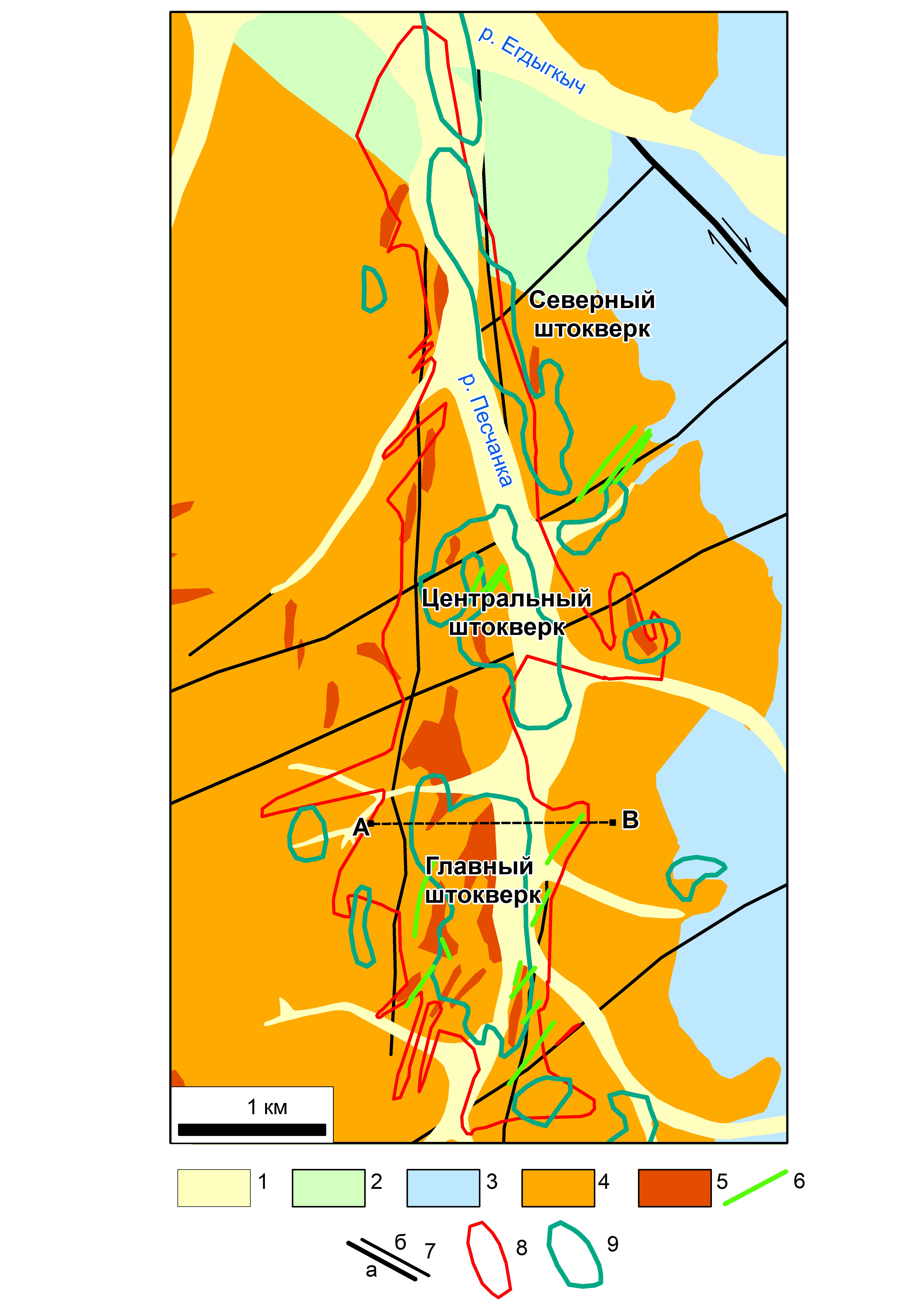 Фиг. 4. Схематизированная геологическая карта месторождения Песчанка (по Chitalin et al., 2021; Джеджея, Сидорина, 2019, с изменениями и дополнениями). 1 — четвертичный аллювий; 2 — нижнемеловые угленосные терригенные отложения айнахкургенской свиты; 3 — вулканогенно-терригенные отложения верхней юры; 4–5 — интрузивные породы егдыгкычского комплекса: 4 — монцодиориты первой фазы, 5 — кварцевые монцонит-порфиры и кварцевые монцодиорит-порфиры второй фазы и кварцевые сиенит-порфиры третьей фазы; 6 — позднемеловые дайки андезитов; 7 — разрывные нарушения: а — Егдыгкычский правый сдвиг; б — сдвиги и сбросо-сдвиги; 8 — проекция контура медной минерализации; 9 — ядерные части аномальных геохимический полей. Пунктирной линией показана линия разреза на фиг. 5.