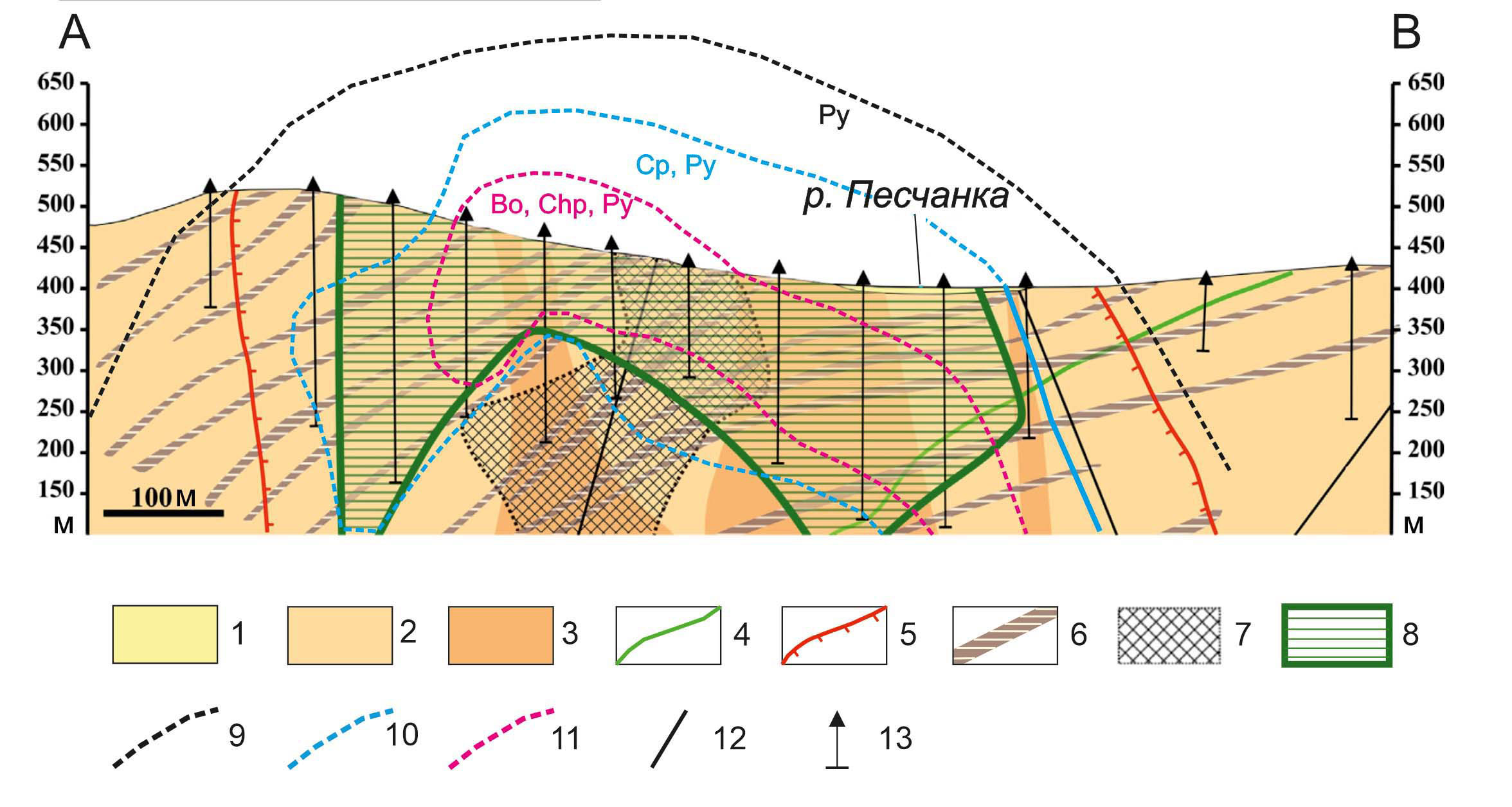 Фиг. 5. Схематический геологический разрез Главного штокверка месторождения Песчанка (по Chitalin et al., 2021, с изменениями). Линия разреза показана на фиг. 4. 1 — четвертичный аллювий; 2 — монцодиориты первой фазы; 3 — кварцевые монцонит-порфиры и кварцевые монцодиорит-порфиры второй фазы; 4 — позднемеловые дайки андезитов; 5 — контур биотит-калишпат-кварцевых метасоматитов; 6 — субвертикальные зоны кварц-серицитовых метасоматитов (пологое залегание зон — кажущееся за счет косого сечения); 7 — кварцевый штокверк; 8 — область медной минерализации по борту 0.2% условной меди, 9–11 — контуры минеральных зон рудной зональности: 9 — пиритовой (Py), 10 — халькопиритовой (Cp), 11 — борнитовой (Bo); 12 — разрывные нарушения; 13 — разведочные скважины.