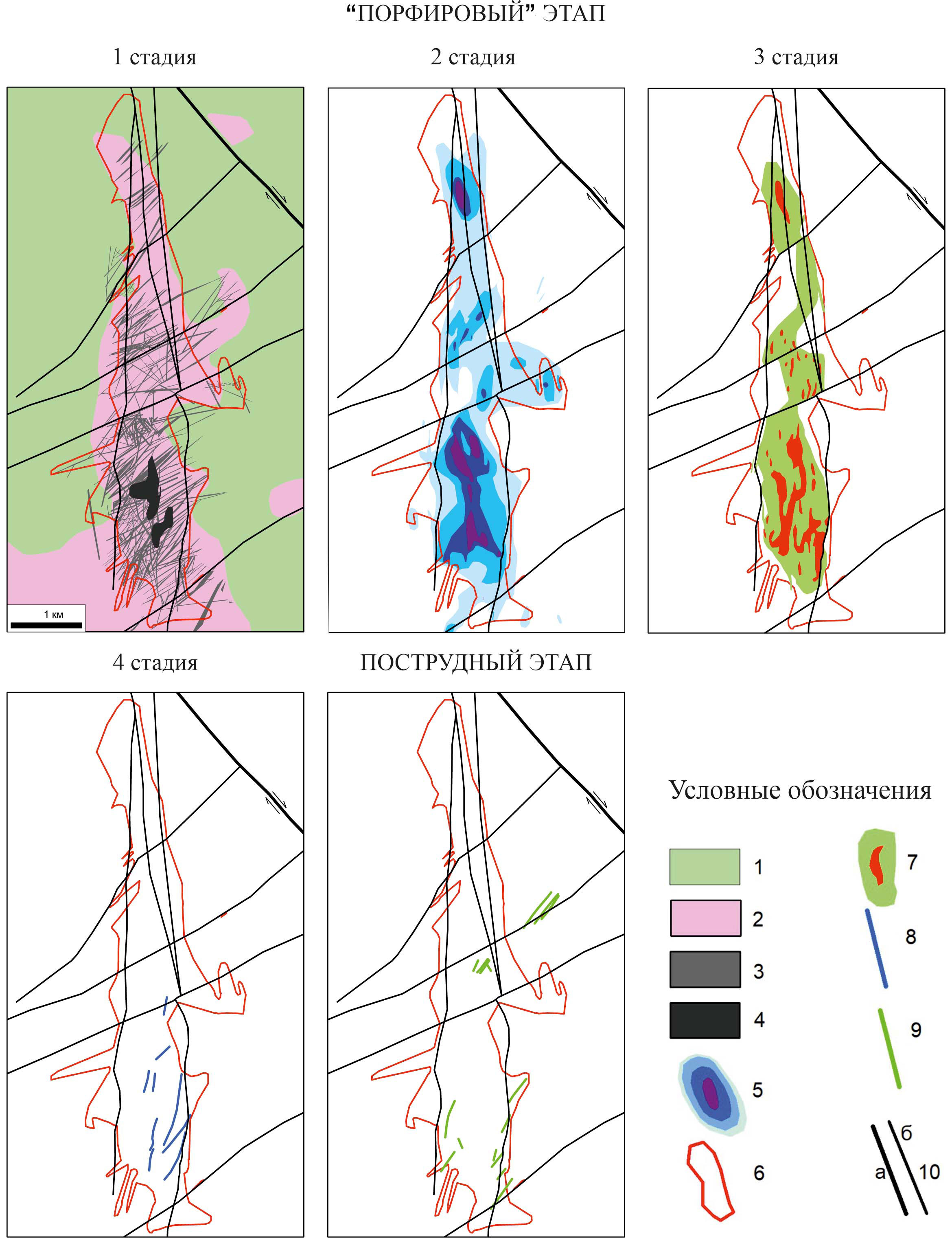 Фиг. 6. Основные стадии развития рудного штокверка месторождения Песчанка (по Читалину, 2021, с изменениями). Пояснения в тексте. Условные обозначения: 1–4 метасоматиты: 1 — пропилиты, 2 — биотит-калишпат-кварцевые, 3 — кварц-серицитовые, 4 — кварцевые полнопроявленные; 5 — объемный процент жильного кварца в штокверке (изолинии 0.1, 1, 5, 10%); 6 — проекция контура медной минерализации; 7 — рудное тело по борту 0.2% условной меди (зеленый цвет) и богатые рудные линзы по борту 0.6% меди (красный цвет); 8 — золотоносные сульфидные жилы; 9 — пострудные дайки андезибазальтов; 10 — разрывные нарушения: а — Егдыгкычский правый сдвиг, б — сдвиги и сбросо-сдвиги.