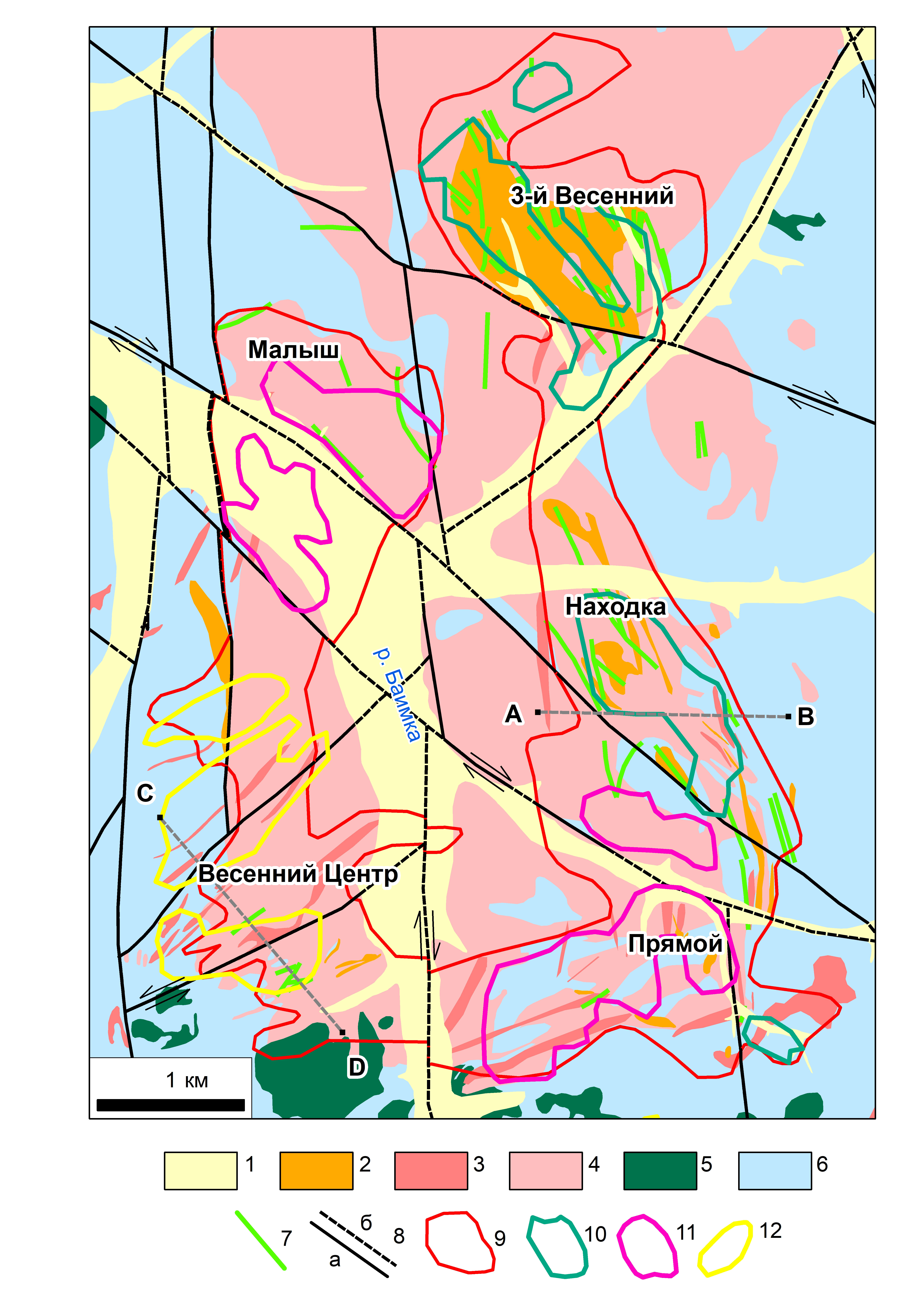 Фиг. 7. Схематическая геологическая карта Находкинского рудного поля (по Chitalin et al., 2022; Сидорина, 2015, 2016, с изменениями). 1 — четвертичный аллювий, 2–4 — раннемеловые интрузии: 2 — монцодиориты и кварцевые монцонит-порфиры егдыгкычского комплекса, 3 — кварцевые диоритовые порфириты второй фазы весеннинского комплекса, 4 — кварцевые диоритовые порфириты первой фазы весеннинского комплекса; 5 — позднеюрские габбродиориты; 6 — верхнеюрские вулканогенно-осадочные отложения; 7 — позднемеловые дайки андезитов; 8 — разрывы: а — достоверные; б — предполагаемые под четвертичными отложениями; 9 — проекция контура медной минерализации на дневной поверхности; 10–12 — ядерные части аномальных геохимических полей: 10 — медно-порфировых, 11 — медно-молибден-порфировых, 12 — золото-серебряных. A-B, C-D — линии разрезов, показанных на фиг. 8 и фиг. 9.