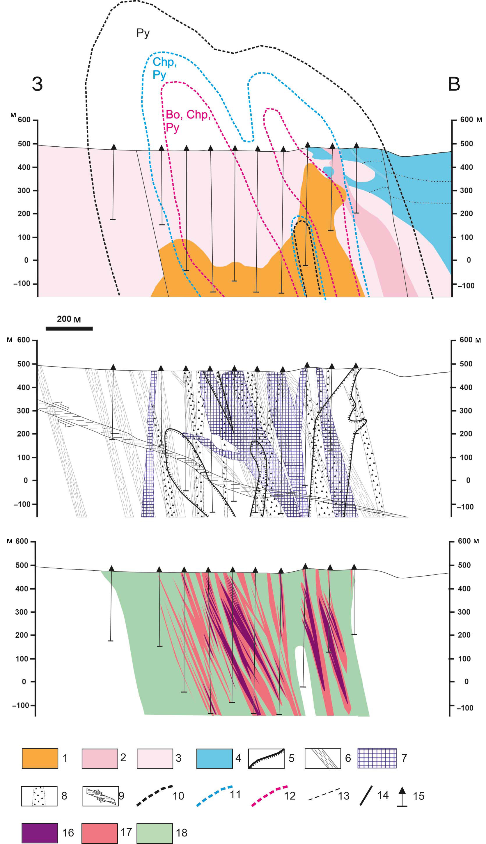 1 — монцодиориты, кварцевые монцонит-порфиры егдыгкычского комплекса; 2–3 –весеннинский интрузивный комплекс: 2 — кварцевые диорит-порфириты второй фазы, 3 — кварцевые диорит-порфириты первой фазы; 4 — верхнеюрские вулканогенно-осадочные отложения; 5 — контур калишпатизации; 6 — зоны интенсивного кварц-серицитового метасоматоза; 7 — кварцевый штокверк; 8 — гидротермальные брекчии; 9 — пострудные надвиговые зоны с горизонтальными гипс-кальцитовыми прожилками по трещинам отрыва; 10–12 — контуры минеральных зон рудной зональности: 10 — пиритовой (Py), 11 — халькопиритовой (Cp), 12 — борнитовой (Bo); 13 — слоистость; 14 — разрывные нарушения; 15 — разведочные скважины; 16–18 — рудные зоны с содержаниями меди: 16 — более 0.5%, 17–0.3–0.5%, 18–0.1–0.3%.