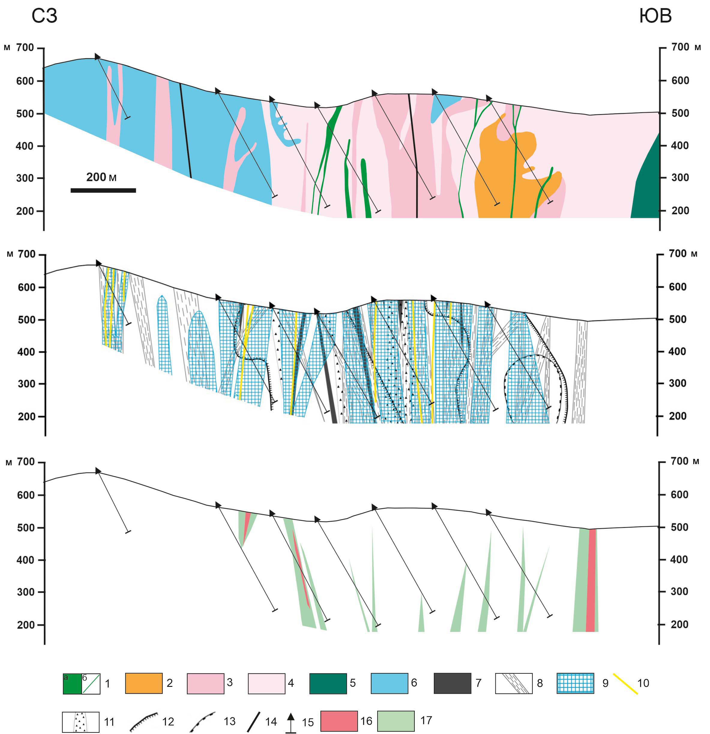 1 — субвулканические тела (а) и дайки (б) позднемеловых андезитов; 2 — монцодиориты, кварцевые монцонит-порфиры егдыгкычского комплекса; 3–4 весеннинский интрузивный комплекс: 3 — кварцевые диорит-порфириты второй фазы, 4 — кварцевые диорит-порфириты первой фазы; 5 — габброиды позднеюрского баимского комплекса; 6 — верхнеюрские вулканогенно-осадочные отложения; 7 — полнопроявленные кварцевые метасоматиты (“вторичные кварциты”); 8 — зоны интенсивного кварц-серицитового метасоматоза; 9–10 — эпитермальные золотоносные кварц-карбонатные штокверки (9) и жилы (10); 11 — гидротермальные брекчии; 12 — контур калишпатизации, 13 — контур биотитизации; 14 — разрывные нарушения; 15 — разведочные скважины, 16–17 — рудные зоны с содержаниями меди: 16–0.3–0.5%, 17–0.1–0.3%.