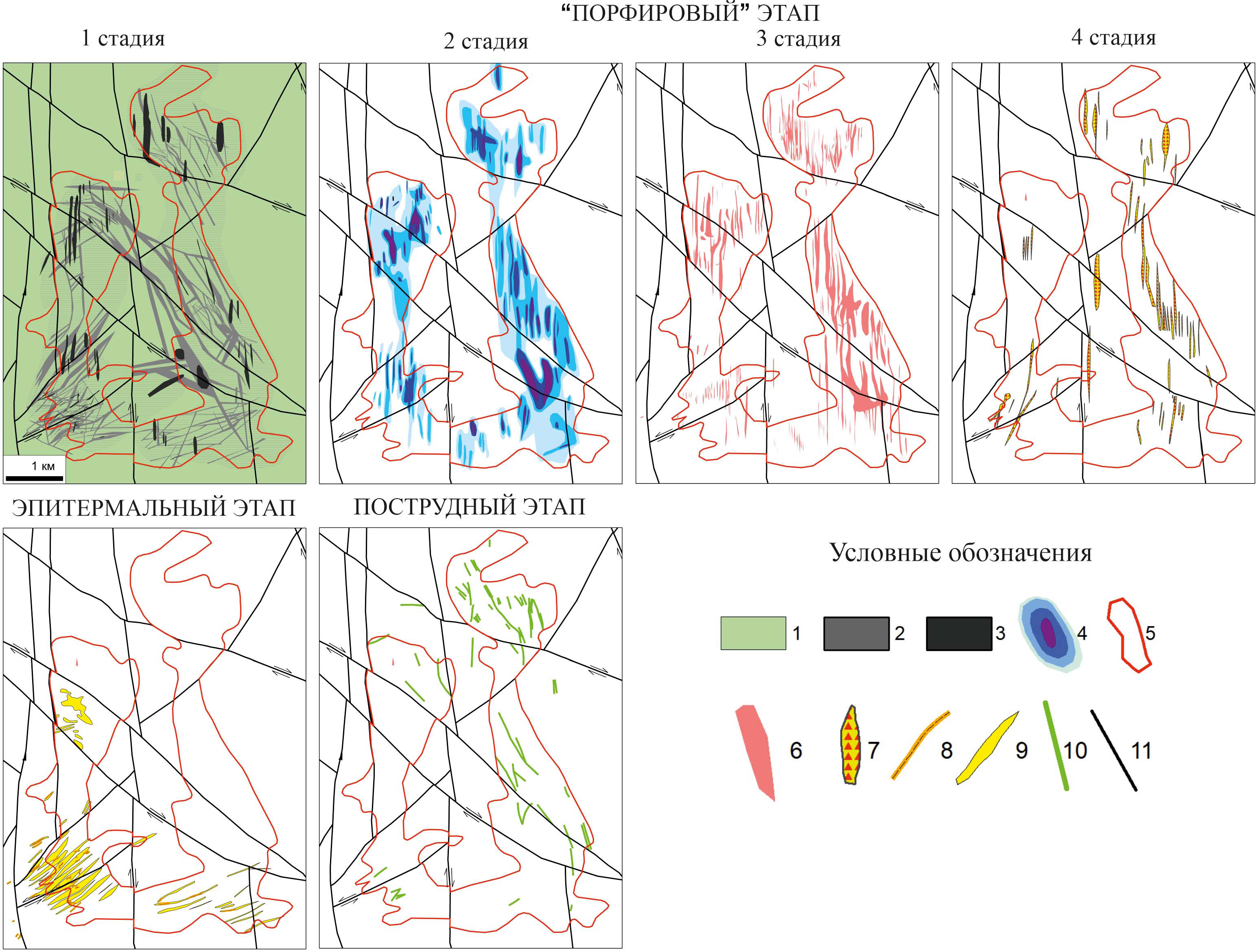 Фиг. 11. Этапы и стадии развития рудной минерализации Находкинского рудного поля (по Читалин и др., 2019; Chitalin et al., 2022), с изменениями). Пояснения в тексте. Условные обозначения: 1–3 — метасоматиты: 1 — пропилиты, 2 — кварц-серицитовые, 3 — кварцевые полнопроявленные; 4 — объемный процент жильного кварца в штокверке (изолинии 0.1, 1, 5, 10%); 5 — проекция контура медной минерализации; 6 — богатые рудные линзы по борту 0.6% меди; 7 — гидротермальные брекчии; 8–9 — эпитермальные золотоносные карбонат-кварцевые образования: 8 — жилы, 9 — штокверки; 10 — пострудные дайки андезибазальтов; 11 — сдвиги и сбросо-сдвиги (полустрелками показана кинематика).