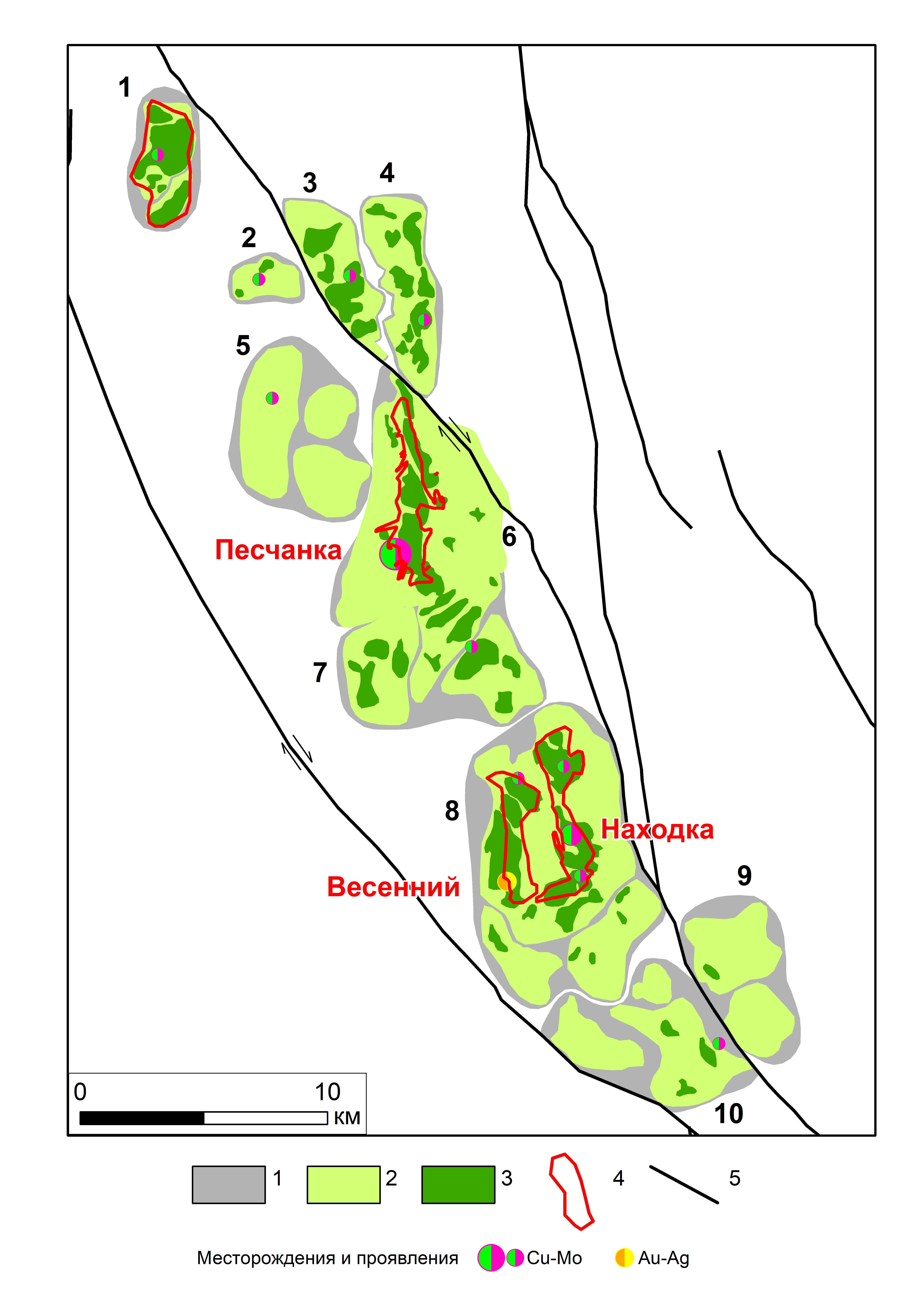 Фиг. 12. Аномальные геохимические поля центральной части Баимской рудной зоны (по Сидориной, 2016; Джеджея, 2019, с изменениями и дополнениями). 1 — Порфирово-эпитермальные системы; 2 — АГХП — внешняя зона; 3 — АГХП — промежуточная и ядерная зоны объединенные; 4 — контуры медно-порфировых штокверков по результатам ГРР; 5 — крупные правые сдвиги Баимской сдвиговой зоны (полустрелками показана кинематика). Цифрами обозначены порфирово-эпитермальные системы: 1 — Юряхская, 2 — Топь, 3 — Егдыгкычская, 4 — Кустовская, 5 — Западно- Песчанкинская, 6 — Песчанкинская, 7 — Таллахская, 8 — Находкинская, 9 — Омчакская, 10 — Светлинская.